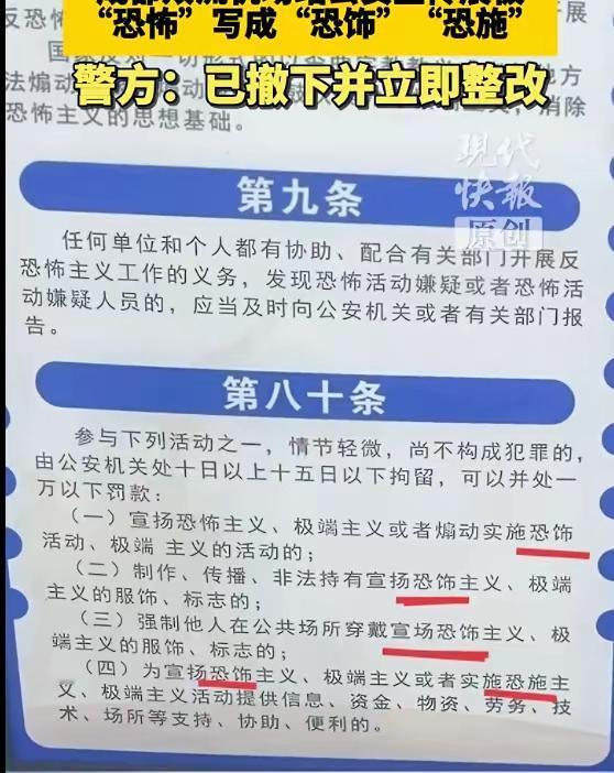呵呵,这错误犯的有点让人接受不了,太离谱了。 宣传展板第八十条中,有四处“恐怖”写成了“恐饰”,一处写成了“恐施”;有一处“宣扬”写成了“宣场”。 毫无疑问,责任在广告公司,底稿中的文字不应该也不可能出现这样的错误。 估计这是用五笔字型打字惹的祸,要么就是扫描文件时 AI识别出错,然后又进行了复制粘贴,导致错误被“扩散”。 这广告公司也是马虎,就那么自信?在打印出图之前,也不需要校对一下文稿,看看有没有差错? 说实话,这样的错误是实实在在的低级错误,以文化高低无关,只关乎工作的责任心。