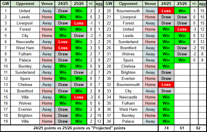 外网博主Nadir制作的关于阿森纳与上赛季阿森纳,与本赛季曼城的战绩对比图。现在