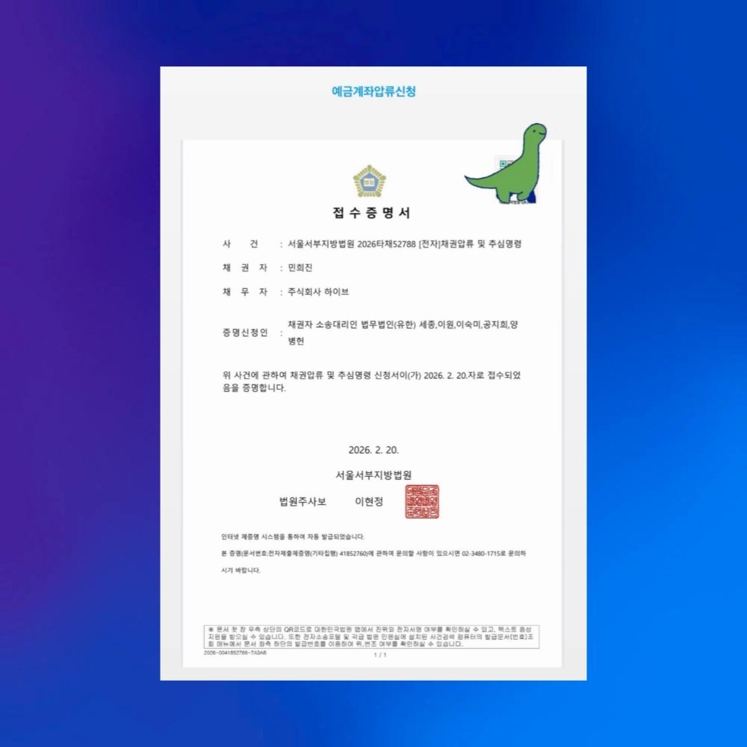 闵熙珍已向法院提交法律申请,要求冻结/扣押HYBE的银行账户,作为追讨债务的一部分。