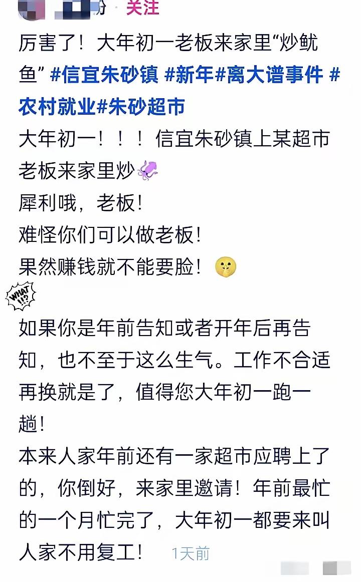 大年初一上门炒鱿鱼!广东茂名超市操作太绝,网友:这老板格局碎一地老板的操作也太没有人情味了 广东茂名一名超市员工年初一被老板"炒鱿鱼”,真是让人开了眼。 大年初一,本该欢欢喜喜过年,朱砂镇一家超市老板居然亲自上门,把员工给辞退了。你说这得多大仇多大怨? 更让人心寒的是,这位员工本有其他工作,是老板亲自上门邀请,她才推了别的机会过来帮忙。年前年货高峰期最累最忙的时候,她踏踏实实扛下来,忙完最苦的日子,转头就被一脚踢开。 没有提前通知,没有补偿说法,专挑万家团圆的大年初一,上门说一句“不用来上班了”。 这哪是辞退,这是卸磨杀驴,是把人情、道义、规矩全踩在脚下。 网友怒了:用人朝前,不用人朝后,吃相太难看!就算要裁员,哪天不行,非要选一年最吉利的日子上门添堵?这不是管理,是故意伤人。 生意再小,不能丢良心;用人再省,不能寒人心。老板省了一点工钱,却丢了口碑、失了人心,以后谁还敢跟你干? 法律也不答应:无故辞退、未提前告知,已经涉嫌违法,员工完全可以主张赔偿,维护自己的权益。 大年初一被辞退,是打工人一年最堵心的开局。这件事也给所有老板提个醒:赚钱要讲良心,待人要留余地。 你遇到过这么坑的老板吗?换作是你,会怎么维权?评论区聊两句!