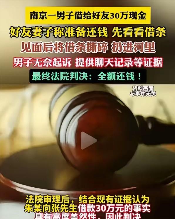 2025年5月,南京一男子借给好友30万现金,万万没想到好友妻子称准备还钱,但要先看看借条,趁机将借条撕碎扔进河里!男子无奈起诉,而法院的判决亮了 三十万,撕成碎片,扔进河里 2025年5月的南京,一条不起眼的河道边,上演了一出让人瞠目结舌的闹剧。纸屑于浑水中悠悠打旋,似在作最后的蹁跹之舞。不多时,便悄无声息地没入这混沌之中,消失不见,仿佛从未出现过一般。扔纸的女人脸上挂着得意的笑,站在一旁的丈夫如释重负 在他们的认知里,这件事已然尘埃落定,好似波澜不惊的湖面,再难泛起涟漪,以为一切就此画上句号 故事要从2017年说起。张先生与朱某交情深厚,二人自龆龀之年便已相识,堪称莫逆之交,是如假包换的发小。他们一同度过懵懂童年,情谊恰似从穿开裆裤时便已缔结,纯粹而深厚。张先生思维敏捷、头脑灵活,凭借着敏锐的商业洞察力与过人的经营智慧,在商海之中游刃有余,将生意经营得有声有色、风生水起。朱某呢,眼瞅着老朋友发达了,心里那股子不甘劲儿就上来了 他也想当老板 启动资金源自何处?自然是张先生。他在资金筹备方面发挥了关键作用,为项目开启提供了必要的财力支持,让一切得以顺利起步。拨通一通电话,提及十万款项,对方未作丝毫迟疑,便慷慨解囊,将款项交付 这钱给得痛快,要得也理直气壮。朱某后来又借了几次,理由都差不多——创业嘛,花钱如流水。截至2019年,林林总总汇聚起来,累计金额竟达整整三十万之巨 张先生这才觉得不对劲,让朱某补了张借条,白纸黑字写清楚,两年内还清,不要利息 时光荏苒,两年匆匆而过。曾所期盼之钱财,如今依旧毫无踪影,恰似水中月、镜中花,令人徒增怅惘 张先生抹不开面子硬要,请人家夫妻俩吃饭,借着酒劲儿把话题往借条上引。朱某夫妇笑呵呵的,说最近忙,过阵子资金就转过来了,肯定还 这所谓的“过阵子”,竟如白驹过隙,一晃便是大半年的时光悄然溜走,往昔仿若还在昨日,却已在岁月长河中渐行渐远 张先生因自身生意需资金周转,实难再缄默。他只好挑明话语:务必于两个月内偿还欠款,若逾期未还,将诉诸法律途径解决 朱某欣然应允,还展现出十足的主动性,主动邀约对方于公园碰面,表示要在面对面的交流中,将钱款事宜妥善结清 张先生紧攥着那张借条,神色略显急切,脚步匆匆朝着目的地赶去,每一步都似带着某种期待与决心。那借条似有千斤重,又似带着某种笃定,让他毅然决然地迈出这一步 见面的时候,朱某妻子特别热情,嘘寒问暖,又是倒歉又是道茶。最后,她笑意盈盈地开口道:“把借条拿给我瞧瞧,我核对下金额,要是没问题就给你转账 张先生未作过多思忖,不假思索间,便将手中之物递了过去,动作干脆而自然,仿佛这是再寻常不过之事。 刹那之间,那张借条犹如风中残叶,瞬间化作无数碎片,于无形之中消散,仿若从未存在过一般。 朱某妻子动作麻利,撕完直奔河边,手一扬,三十万的凭证就这么喂了鱼。夫妻俩对视一眼,那表情分明在说:没证据了,看你怎么办 此三十万均以现金方式交付,未留存任何转账痕迹,如此操作,仿佛能隐匿资金流动的蛛丝马迹,却也在无形间增添了几分难以言说的神秘 如此方式,在当今电子支付盛行之时代,显得尤为特殊,也为后续之事增添了几分神秘色彩。他们所押注的,正是这一关键之处。看似冒险之举,实则将筹码尽数置于此,赌的便是这一点能带来他们所期望的结果。此般冒险之举,似将筹码尽数置于这一关键之上,成败皆系于此 张先生如遭雷击般僵立原地,眼神凝滞,仿佛被无形的力量定住。许久,他的思绪才缓缓回笼,却依旧沉浸在惊愕之中,一时难以回神。等反应过来,人家已经换了副嘴脸:什么借条?何来欠款之说?难道仅凭你空口一言,便认定确有其事?如此无端指认,实在难以令人信服 若换作他人,或许便会就此认栽。在困境面前,多数人往往缺乏坚持与抗争的勇气,只能无奈接受既定的结果。但张先生做了一件事——他掏出手机,把现场拍了下来。河面上还漂着没沉底的纸屑,朱某夫妇得意洋洋的嘴脸,全在镜头里 这些年来,他始终留存着催债时与对方的微信聊天记录。那些记录,宛如岁月的见证,默默诉说着过往的催债历程。朱某曾于其中亲口承认欠款之事,相关记录白纸黑字,确凿无疑,即便想删也难以做到 法院开庭当日,朱某夫妇仍未收敛其顽劣之态,妄图以狡辩之辞混淆视听,试图逃避应有的法律制裁。他们的所作所为,实在是有违公序良俗,令人发指。其行径之恶劣,简直突破了道德底线,着实让人鄙夷,难以容忍 法官不为所动。聊天记录详实、现场视频清晰、证人证言确凿,各项证据环环相扣,完整无误地构建起了严密的证据链条。一审判决:朱某还钱,三十万,一分不少 朱某不服,上诉 二审尘埃落定,结果简洁明了,仅四字便揭晓——“维持原判”。这简短判定,如重锤定音,为案件画上阶段性句号 (信息来源:光明网——男子向朋友借30万元为赖账撕碎借条,被判还钱)