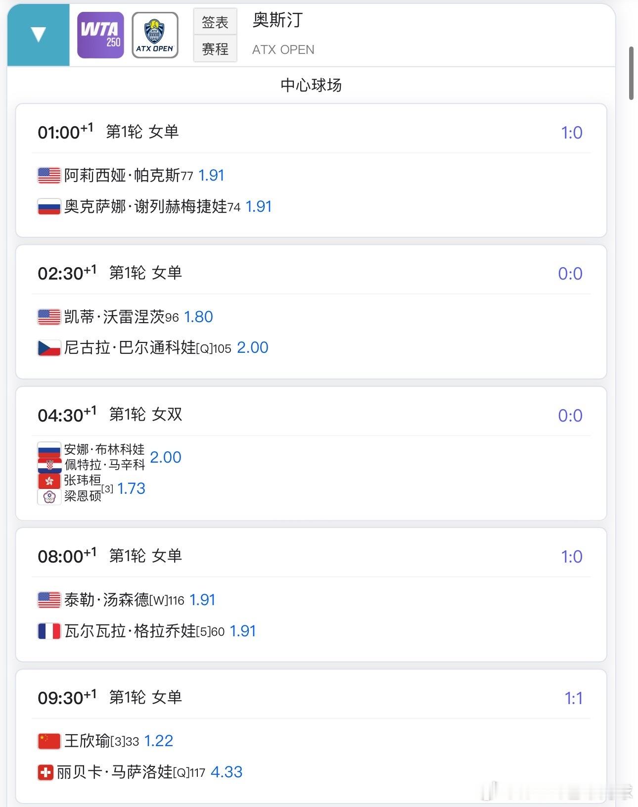 WTA250奥斯汀中心球场明早不早于9:30王欣瑜🇨🇳vs马萨洛娃🇨🇭