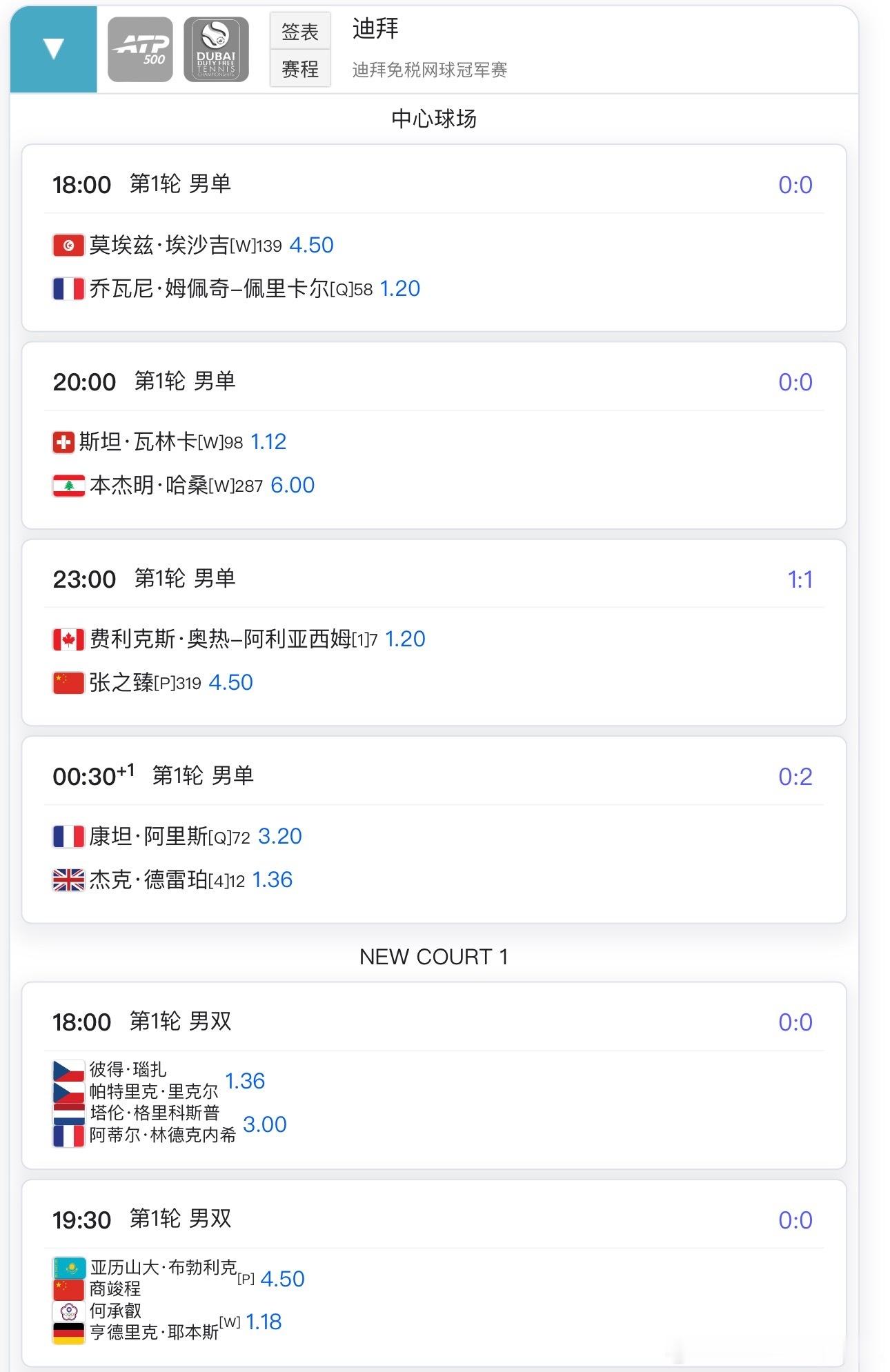 ATP500迪拜中心球场不早于23点张之臻🇨🇳vs阿利雅西姆🇨🇦