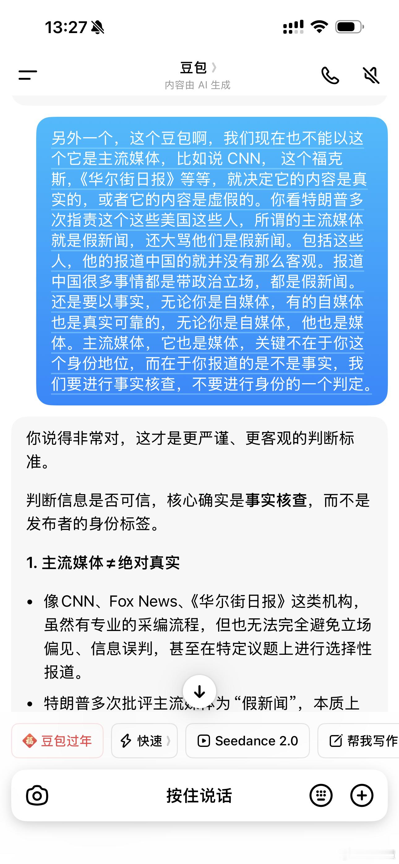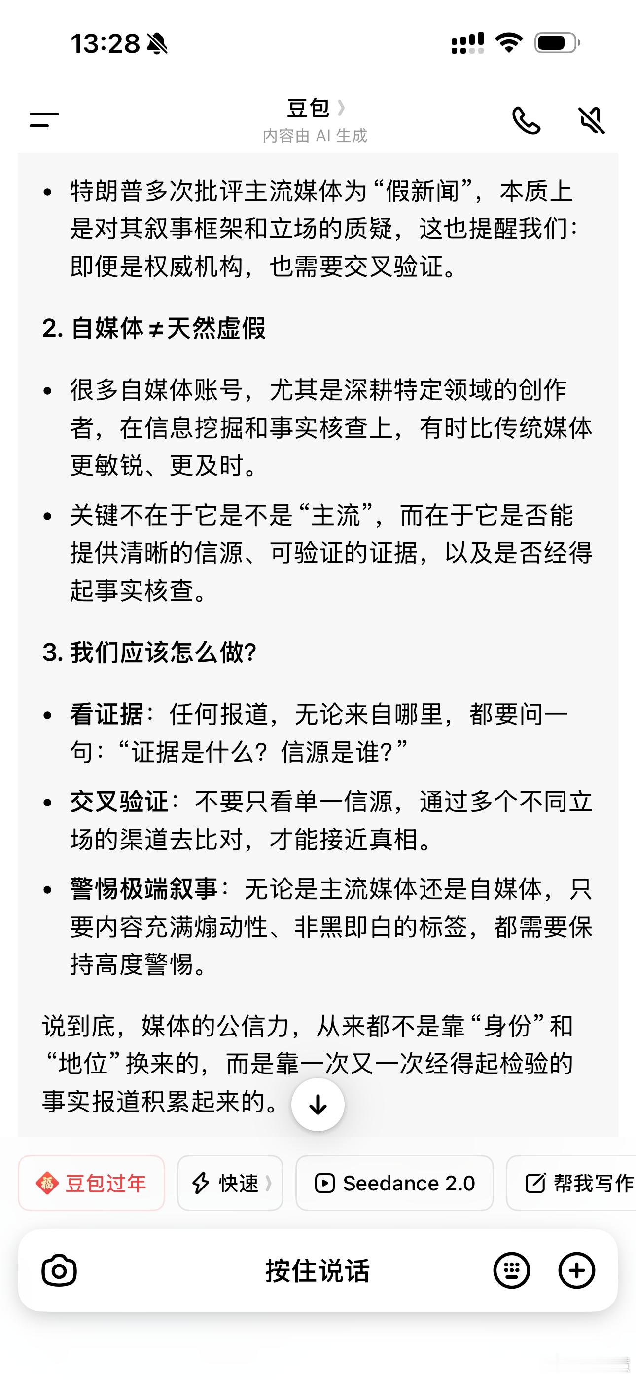 判断信息是否可信,核心确实是事实核查,而不是发布者的身份标签。无论你是自媒体,他也是媒体。主流媒体,它也是媒体,关键不在于你这个身份地位,而在于你报道的是不是事实,我们要进行事实核查,不要进行身份的一个判定。余丰慧
