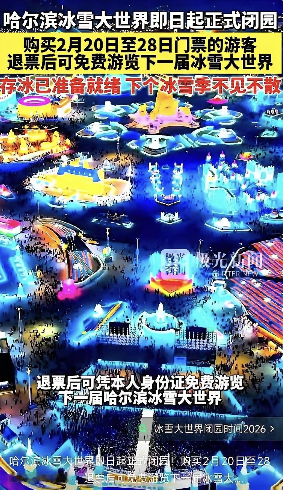 2月20号开始升温,冰雕开始滴水、掉渣,栏杆上都是湿的。22号天气又冷回去,零下十几度,冰面重新硬了——按理说能开,但官方直接发公告:正式闭园,不商量。 退票一分不少,原路退回,连手续费都省了。更狠的是,20到28号买过票的人,明年直接刷身份证就能进,不用预约,不用领券,也不用解释。 工作人员原话说:“天气实在不太行,不太支持继续开园。”没提安全风险多严重,也没说损失多大,就一句“不太行”,然后关门。 冰雪大世界不是普通游乐园,是拿整块冰雕的塔、钢琴、生肖,差一点融,就是差一点假。游客拍照发朋友圈,图的就是一眼震撼——不是“差不多就行”。 去年退票风波连夜整改,今年连补偿都懒得搞花样,身份证一刷就完事。不是流程有多先进,是压根没打算让游客多跑一趟。 全网夸它,真不是因为退钱痛快。是现在太少有人愿意为“看起来体面”多花几百万,少赚几千万。 门关了,票根还在手机里。