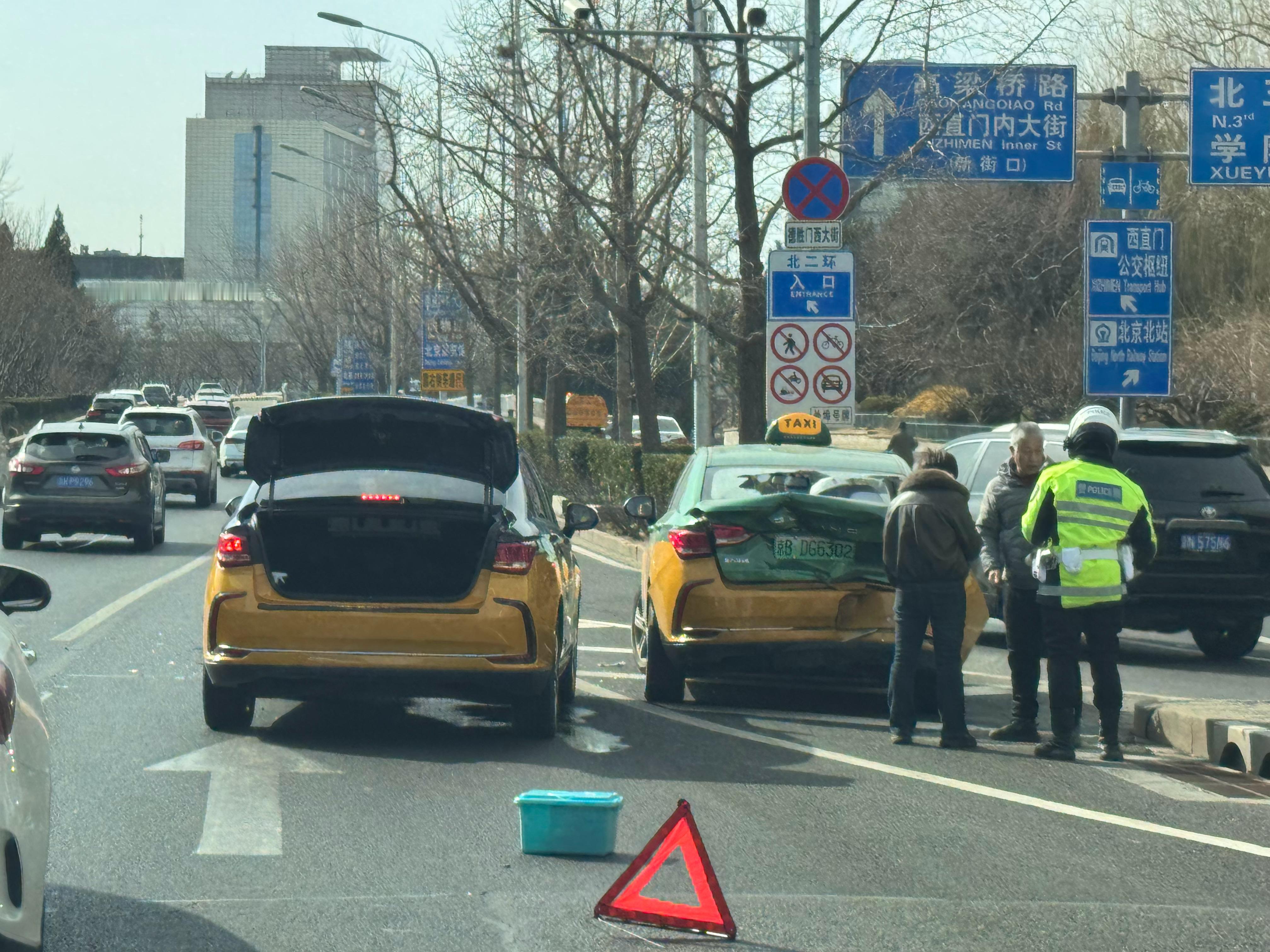此刻,西直门最堵的地方,俩出租车撞了。
