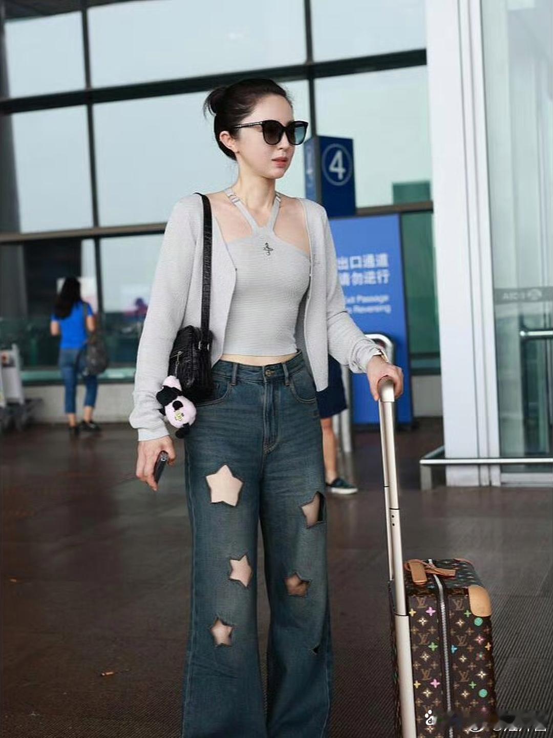 董璇机场照,这星星破洞牛仔裤很潮