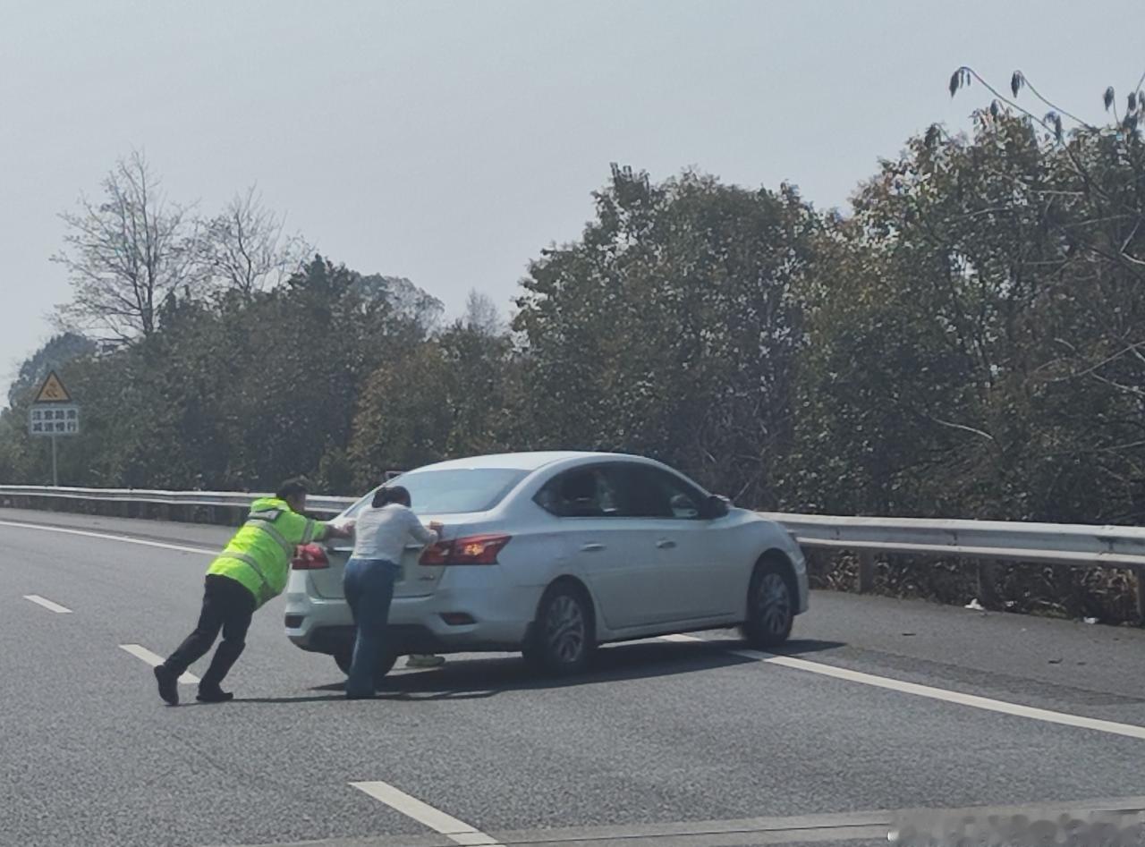 2月22日, 常宁大队民辅警巡逻至许广高速往南911公里处时,发现一白色小车因故障停在行车道上,民警迅速下车做好安全防护,与驾驶人一起将车子推至应急车道。