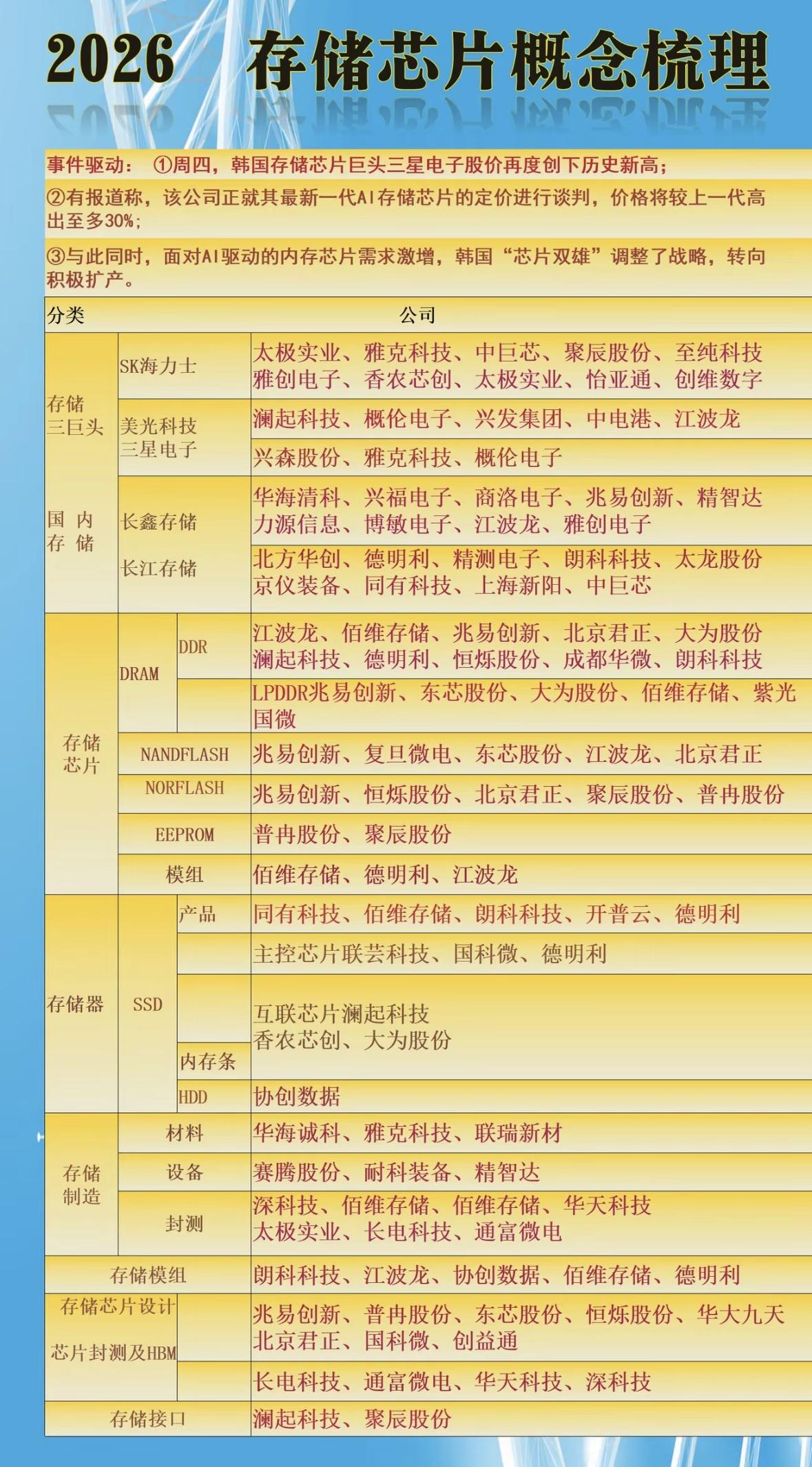 储存芯片概念最近很火。它涵盖DRAM、NAND、NOR及HBM等,是AI服务器、数据中心、智能终端的核心算力底座,国产替代加速让其景气度持续向上,全球存储还进入了“超级牛市”。 像江波龙、佰维存储等都是相关概念股。江波龙是本土存储模组龙头,Lexar+FORESEE双品牌覆盖全场景,有自建封测基地和高堆叠封装能力,技术上也有自研工艺和算法。佰维存储是嵌入式存储模组先锋,车载产品通过车规认证,AI服务器内存条进入头部云厂商集采。不过投资有风险,不能只看概念就冲动入局。