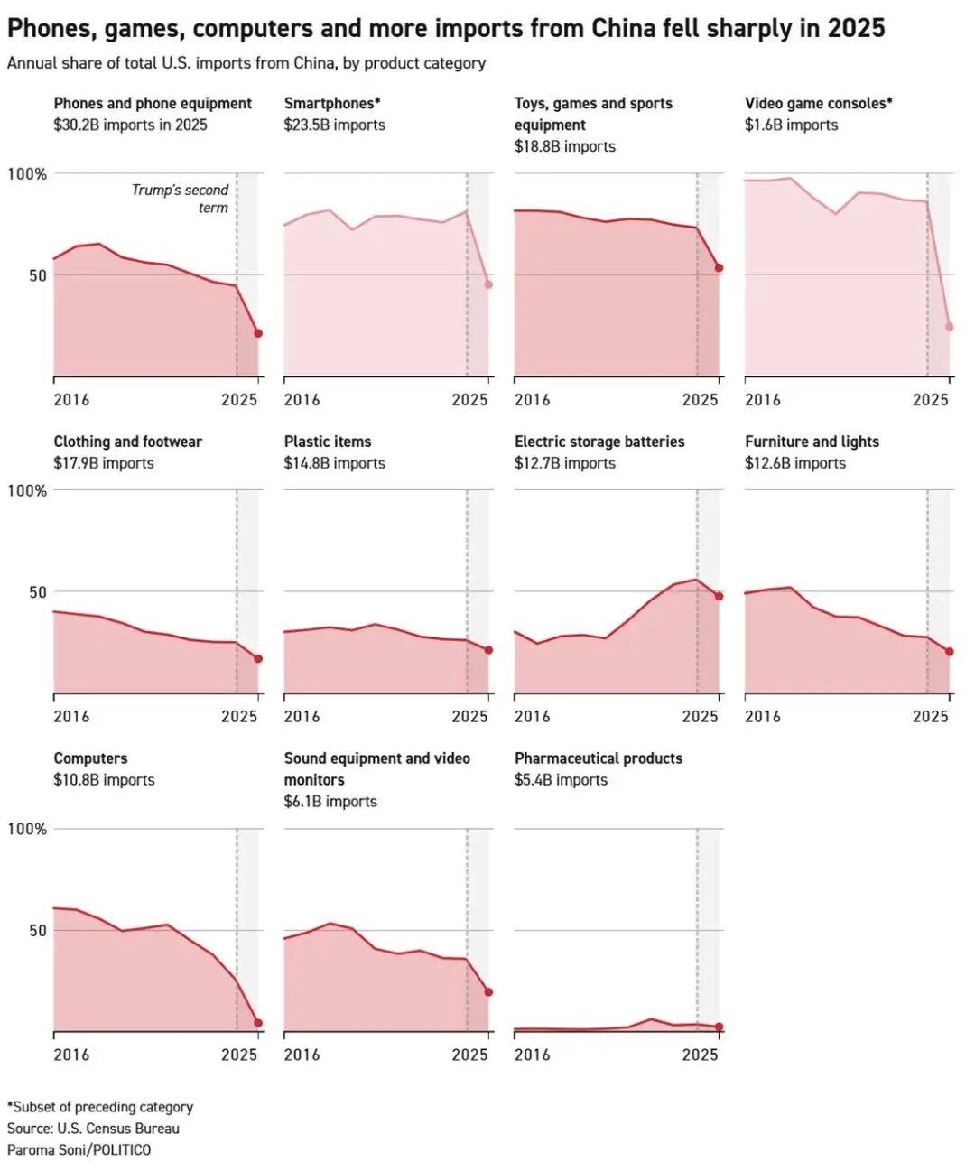 特朗普具有历史意义的关税政策,在2025年重塑了全球贸易格局,而经历最大贸易变化的莫过于中国。据美国商务部周四发布的12月贸易报告显示,中国占美国整体进口市场的份额从2024年的13.4%降至2025年的9%,这是自21世纪初以来中国在美国进口市场中的最低占比。而不到十年前,中国还占据着美国年度进口总额的五分之一。 2025年,美国自中国进口额降至3080亿美元,为2009年以来最低水平,较2018年创下的5390亿美元历史高点下降逾42%。 据惠誉评级测算,综合特朗普去年宣布的所有关税措施及其随后给予的部分豁免,中国商品在11月被征收的美国“实际”关税税率为30.9%,印度为19.7%,越南为12.7%,欧盟为8.1%,墨西哥为4.2%,加拿大为3.7%。当然,有越来越多的美国民众已经恍然大悟,针对不同国家物品所征关税,是由美国国内的进口方、购买方支付。 图片来源于网络