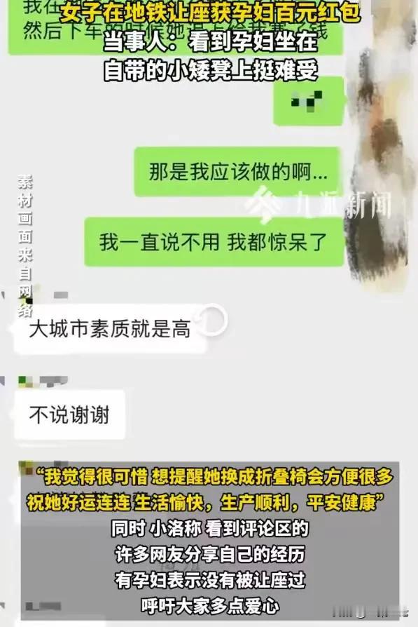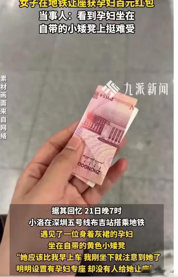 广东深圳,女子坐地铁,发现旁边有一个孕妇,坐在自带的小椅子上,看起来挺难受的,她就给孕妇让座,孕妇一开始拒绝了,后来女子坚持让座,孕妇这才坐到女子的位置上,两人出地铁时,女子没想到,孕妇给了她100元的红包,她很惊讶,网友就说了,有这100元打车不好吗?一个孕妇非得要挤地铁,可有人说,这不是100元的事情。 小洛很惊讶,她看到孕妇给她递过来一个红包,她愣住了,孕妇祝她新年快乐,说完就走了,小洛还没反应过来,孕妇就走远了。 她以为这红包应该也只是10元钱,可能就是孕妇出于感激,给她的新年祝福,她当时就没有把红包返还给孕妇,后来她拆开发现红包是100元,她震惊了,可孕妇已经消失在人群中。 看着手里的100元红包,她真的很惊诧,她没想到自己只是小小的一个善举,孕妇就如此感激她。 说起这件事,小洛感慨万分。 当时她上了地铁,正好看到有一个位置,她眼疾手快,先占为强。 过年了,挤地铁的人比较多,她先上来不坐这个位置,一会儿就有人坐了。 她庆幸地坐在位置上,她刚坐好,突然发现面前有个孕妇,她正坐在一个小椅子上,这个小椅子,应该是孕妇自己带的。 看来孕妇也知道挤地铁,人会比较多,所以自己准备了一个小椅子。 小洛看到这一幕,看着孕妇肚子大大的,双腿也施展不开,看起来挺辛苦的,她心里就有些难受。 虽然她坐的位置不是老弱病残幼专属的位置,但她依然坐立难安,特别是看到,孕妇专用座的那些人,都没有让座,她心里更不是滋味。 可能这些人看着孕妇自己带了小椅子,就没有人想着给她让座。 小洛看着孕妇,缩着双腿,坐在小椅子上,真的挺难受的,她就跟孕妇说:“你来坐我的位置吧!这样缩着腿坐着,人不舒服。” 孕妇一看有人给她让座,略显惊讶,但她不想给别人造成困扰,就跟小洛说:“我有小椅子,不用了。” “你这样坐着,多难受呀,没事,你就坐我的位置吧!”小洛一看孕妇,不愿意坐她的位置,她都有些着急了。 孕妇一看小洛是真心让座给她,就站了起来,坐到她的位置上。 看着孕妇终于没那么辛苦了,小洛这才感到有些许欣慰。 这是很平常的一件小事,在小洛看来,她不过是举手之劳,她有的是力气,挤地铁也是家常便饭,她并没有将这件小事放在心上。 让她惊讶的是,她是和孕妇一起出地铁,分别时,孕妇居然给了她一个红包,祝她新年快乐。 当时的小洛就有些反应不过来,她知道广东这边,过年都会给熟悉的人一个小红包,一般是5元,10元,孕妇可能就是出于祝福,才给了她一个小红包,小洛当时没有想过要拒绝孕妇的好意。 她只是有些惊讶,孕妇会给她红包,孕妇给了她红包之后,转身就走了。 后来她看着红包,觉得好奇,就打开一看,居然是100元的红包,她震惊了。 没想到自己小小的一个善举,孕妇居然如此感激她,这红包有点大。 小洛有些后悔自己当时没有追上去,把红包返还给孕妇,100元实在太多了。 看到孕妇愿意拿出100元感激小洛,有人就说了,孕妇自己身体不方便,有这100元为何不打车,挤地铁多累呀,别人让座也不是,不让座也不是,会给别人增添麻烦。 但有人说孕妇拿出这100元作为感激,并不是她不愿意花这100元打车,而是在当时的情况下,她感受到了来自陌生人的关心,所以她愿意拿100元红包感激小洛,这是双向的温暖,与100元的金额无关。 确实如此,给老弱病残幼让座,本就是美好的传统,孕妇自己带小椅子上地铁,可能就是不想给别人增添麻烦,孕妇本身也是一个善良的人,当她又遇到另一个善良的人,她懂得感恩,所以这100元的意义很大。 其实地铁上一般都有爱心专座,如果有人坐的是爱心专座,那么让座是带有强制性的法律义务,如果是坐的是普通座位,让座是受到鼓励的道德行为,别人不可以强迫。 因此让不让座, 要看自己坐的是爱心座位,还是普通座位,更要看当事人的真实意愿,不可强迫要求他人让座,否则就是扰乱公共秩序的行为。 《治安管理处罚法》第23条规定:有扰乱公共秩序行为的,处警告或者二百元以下罚款;情节较重的,处五日以上十日以下拘留,可以并处五百元以下罚款。 女子坐的是普通座位,她主动让座,这是善良的行为,是应当得到他人赞扬的,孕妇感激她,这是双向奔赴的温暖。 那么你对她们的事情有何看法呢?