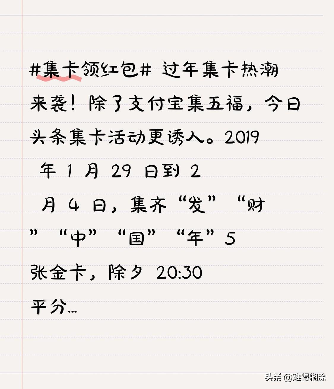 过年集卡热潮来袭!除了支付宝集五福,今日头条集卡活动更诱人。2019 年 1 月 29 日到 2 月 4 日,集齐“发”“财”“中”“国”“年”5 张金卡,除夕 20:30 平分 3 亿红包,前 188 名还额外得 10 克金卡!还有 5 亿红包雨等你抢。登录用户每天领 3 张卡,分享好友能多得抽卡机会。别错过这薅羊毛的好时机!