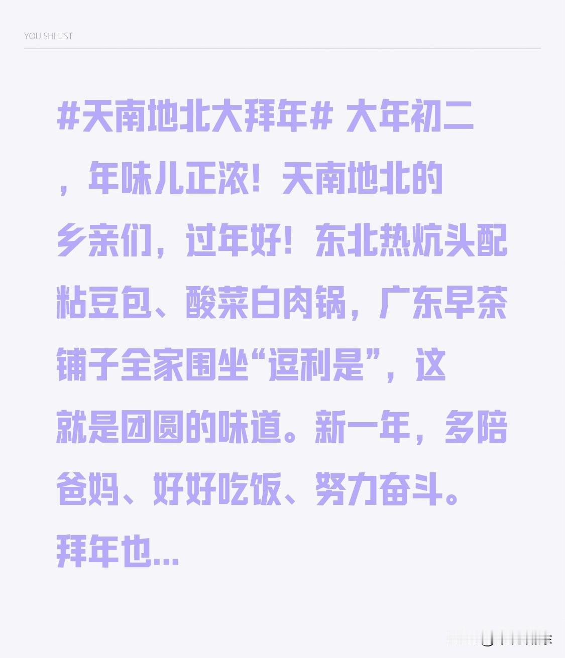 大年初二,年味儿正浓!天南地北的乡亲们,过年好!东北热炕头配粘豆包、酸菜白肉锅,广东早茶铺子全家围坐“逗利是”,这就是团圆的味道。新一年,多陪爸妈、好好吃饭、努力奋斗。拜年也别只说“新年快乐”,给不同人用不同祝福语,超接地气!