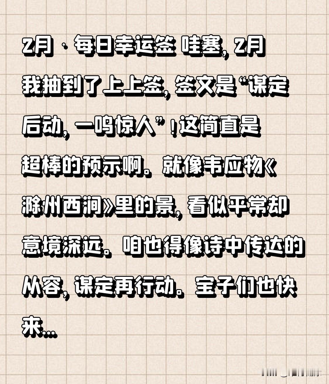 2月·每日幸运签 哇塞,2月我抽到了上上签,签文是“谋定后动,一鸣惊人”!这简直是超棒的预示啊。就像韦应物《滁州西涧》里的景,看似平常却意境深远。咱也得像诗中传达的从容,谋定再行动。宝子们也快来戳链接抽个签,说不定你也有好运降临!