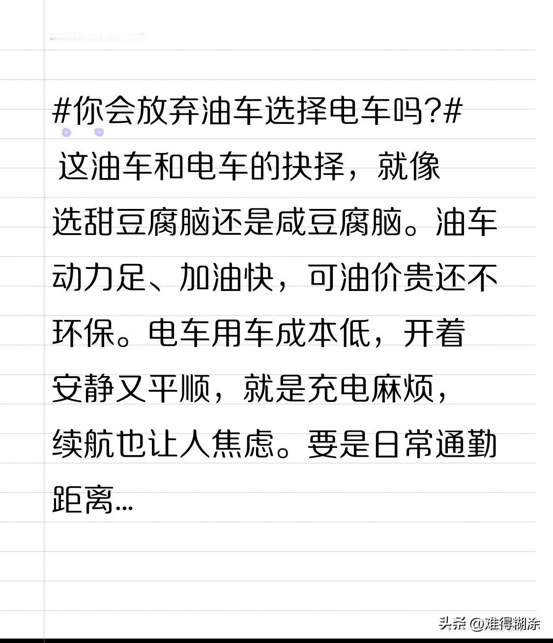 你会放弃油车选择电车吗? 这油车和电车的抉择,就像选甜豆腐脑还是咸豆腐脑。油车动力足、加油快,可油价贵还不环保。电车用车成本低,开着安静又平顺,就是充电麻烦,续航也让人焦虑。要是日常通勤距离短、充电方便,那果断选电车,省不少钱呢。但长途多的话,油车还是更靠谱。