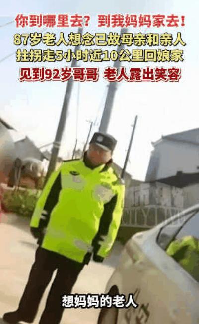 “看哭了!”江苏盐城一87岁白发老人,瞒着家人,凌晨5点杵着拐杖独自出门,徒步近10公里、耗时5小时,只为回娘家见一见亲人,走到体力不支坐在国道边,民警询问时,一句朴实的“到我妈妈家去,我想妈妈了”,瞬间戳中人心,她的娘家,还有亲人在等她吗? 凌晨五点,天还未完全亮,街道上寂静得只有路灯的微光在地面投下斑驳的影子。江苏盐城的曹奶奶悄悄打开家门,拄着一根已经磨得发亮的木质拐杖,慢慢迈出步子。 87岁的她,满头白发,背影略显佝偻,但那双眼睛里闪烁着一种执着的光。 她没有告诉家人,没有打招呼,甚至连自己的孙子孙女都不知情——她有一个心愿,一个被压在心底许久的念想:回娘家,见一见自己的母亲,哪怕只是最后一面。 曹奶奶的步伐缓慢而坚定,每一步都像在和岁月对话。她的脚程已经不如从前了,可她心中的思念比任何疲惫都要沉重。 一路上,她穿过熟悉的巷子,越过昏黄的路灯,呼吸着清晨微凉的空气,脑海里不断回想起母亲慈祥的笑容、温暖的怀抱,还有小时候躺在母亲膝上的那份安心。 “我要去我妈妈家,我想妈妈了。”这是她唯一的念头,也是她默默支撑自己的动力。 国道旁,晨雾轻轻笼罩着大地,空气中带着淡淡的泥土香。曹奶奶走了许久,腿脚渐渐发软,呼吸也变得急促。她坐在路边的石墩上,拄着拐杖,望着远方。 此时,她已走了近10公里,整整耗时五小时。阳光尚未完全升起,路上几乎没有行人,只有偶尔驶过的车辆投下短暂的阴影。 正巧,这时民警巡逻路过,发现了坐在路边的老人。民警小心地走近,蹲下身,温声问道:“老人家,您怎么一个人在这里?是不是迷路了?要不要送您回家?” 曹奶奶抬起疲惫却坚定的眼神,看着面前的民警,声音沙哑却清晰:“我…我要去我妈妈家,我想妈妈了。”这简单的一句话,如同一记重锤,直接击中了民警的心。 民警一时间愣住,眼角甚至湿润了。他们看着老人满头白发、拄着拐杖的模样,瞬间明白了她背后的故事:不是迷路,不是意外,而是一份跨越岁月、跨越距离的思念。 民警赶紧扶起曹奶奶,将她带到车上,询问具体地址。老人指向一个熟悉而又遥远的方向,眼中闪烁着回忆的光芒。一路上,曹奶奶偶尔低头闭目,嘴里轻声念叨着:妈妈,你在家吗? 网友们看到新闻后,无不感动落泪。在评论区,有人写道:“87岁的老人,竟然还能走10公里,只为了见一面母亲,这份孝心令人动容。” 也有人感慨:“我们忙着追求名利、应付工作,却常常忘了陪陪自己的父母、祖父母。曹奶奶提醒我们,亲情是生命中最温暖的灯。” 更多的人开始分享自己与母亲、与老人之间被忽视的瞬间,有的甚至因为看了新闻立刻打电话给父母,告诉他们:“我想你了。” 当曹奶奶终于踏进娘家的大门时,母亲已在门口等待,看到熟悉的身影,激动地泪水夺眶而出。两人紧紧相拥,仿佛要把几十年的思念都融入这一刻。 曹奶奶轻声说道:“妈,我终于来了。”母亲只顾抚摸女儿的白发,哽咽着说不出话。那一刻,岁月的流逝似乎都停滞了,只剩下母女之间的深情和温暖。 曹奶奶徒步回娘家的消息一经曝光,很快在网络上刷屏,短短几个小时,就被成千上万的网友转发、评论和点赞。 有人看完视频后,留言感慨:“87岁的老人,还能徒步十公里,只为见一面母亲,这份孝心,比任何礼物都珍贵。” 评论区里,越来越多的人开始分享自己与父母的故事,有的人写道:“我以为每天给爸妈打个电话就够了,可真正陪伴的时间却少得可怜。” 还有网友深思:“我们总觉得时间很多,明天还有机会,等有空再回家。但父母真的还能等多久呢?有些遗憾,是再也弥补不回的。” 留言里充满了悔意,也充满了对亲情的珍惜,大家纷纷表示要改变自己的生活方式,多花时间陪伴长辈。 曹奶奶简单的一句话——“我想妈妈了”——像一把钥匙,打开了无数人心底最柔软的角落。 网友们在感动中泪目,也在反思中行动:亲情,不是等来的,而是要用心去珍惜、用行动去证明。 这件事让网络世界静默了一会儿,又被温暖填满。