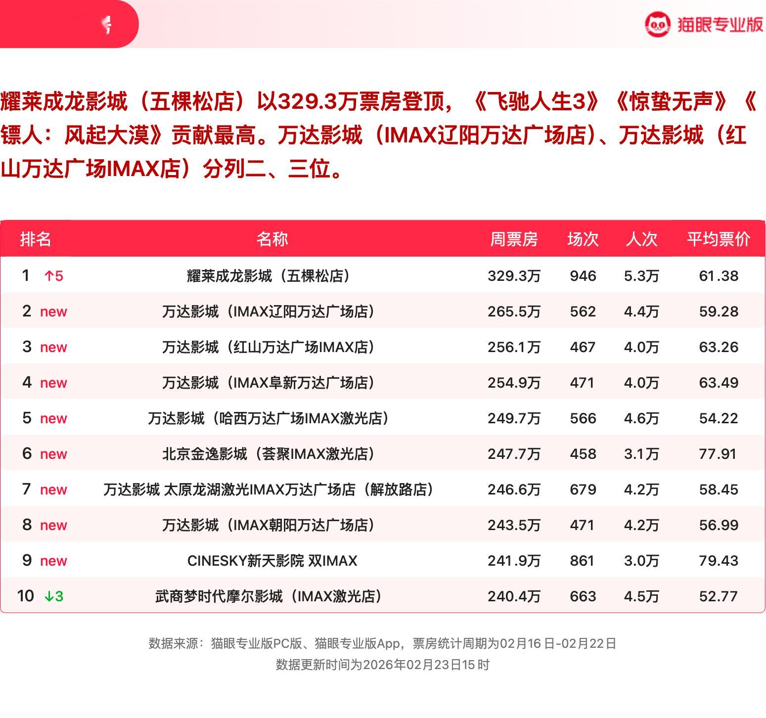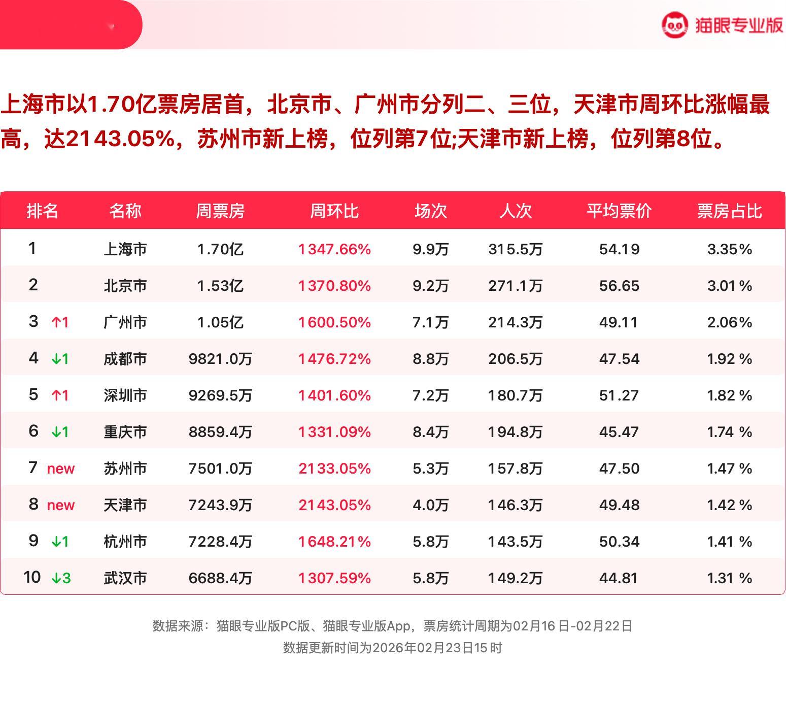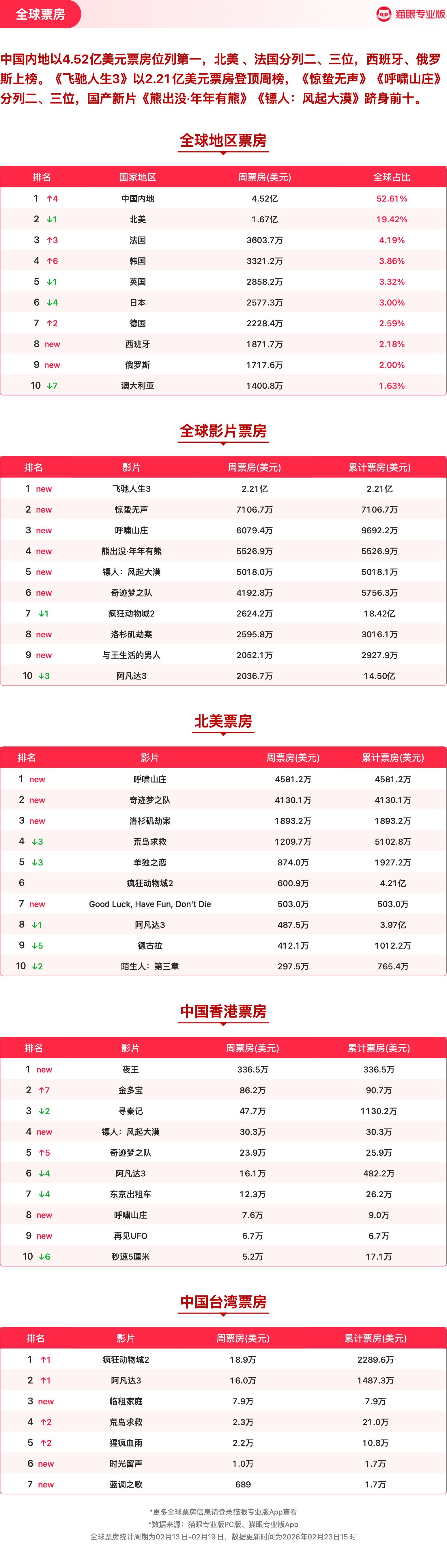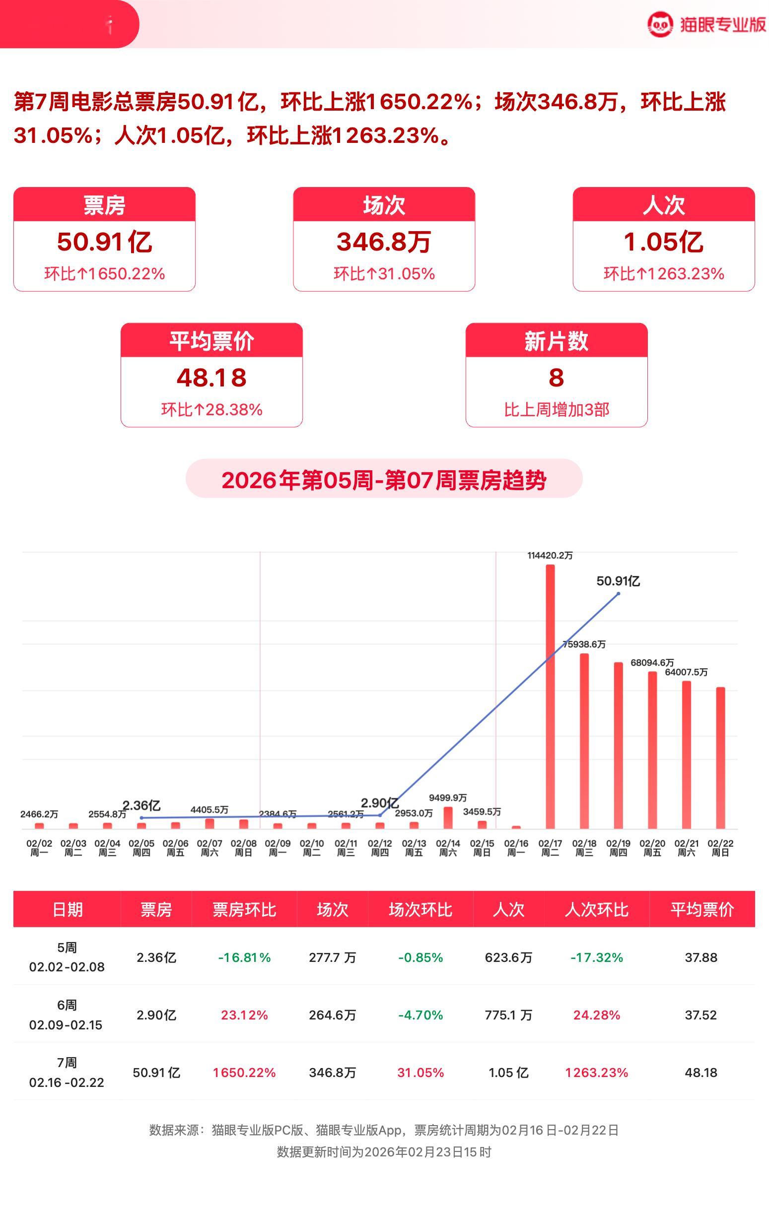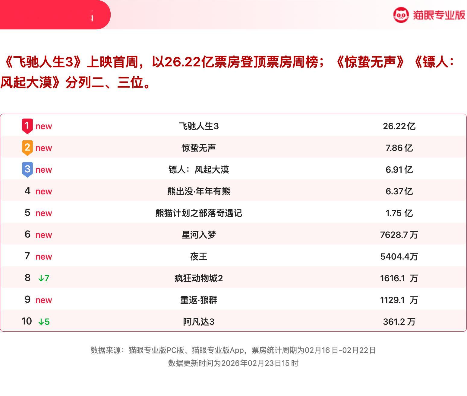 飞人生3强势领跑票房周榜 猫眼专业版2026年第7周电影周报发布📒:周票房50.91亿,《飞驰人生3》强势领跑🏆,《惊蛰无声》《镖人:风起大漠》分列二三位。猫眼电影行业周报