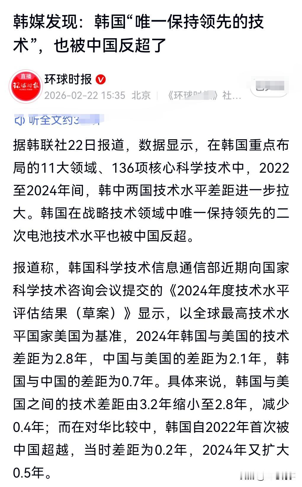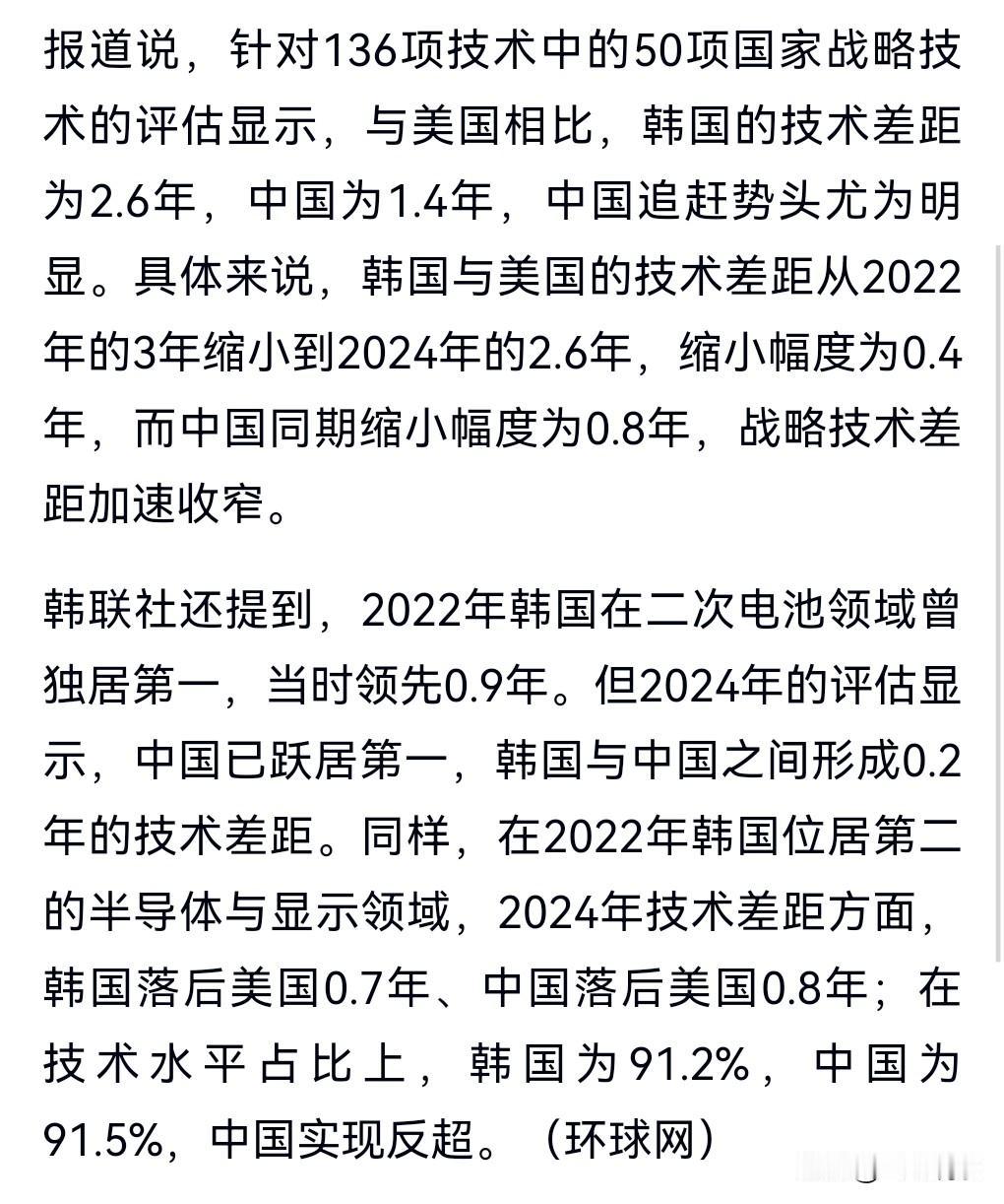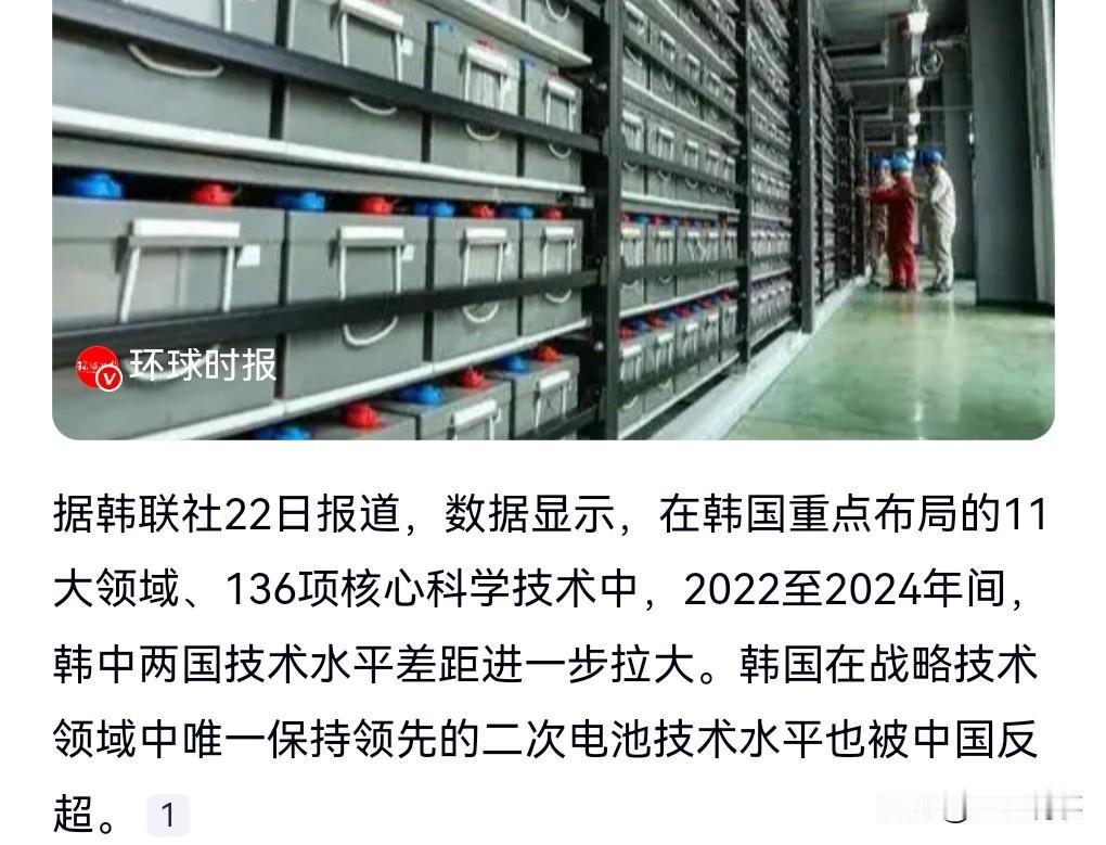 好消息,好消息。 2月23日热搜,韩媒称韩唯一领先技术被中国反超。 韩国在战略技术领域中唯一保持领先的二次电池技术水平也被中国反超。 这真是好消息啊!这说明我们中国越来越充满智慧了。 这个世界第一的宝座,必须我们来坐才行,毕竟我们人口也多。 人口一多,出人才出成果,那肯定是很合理的。