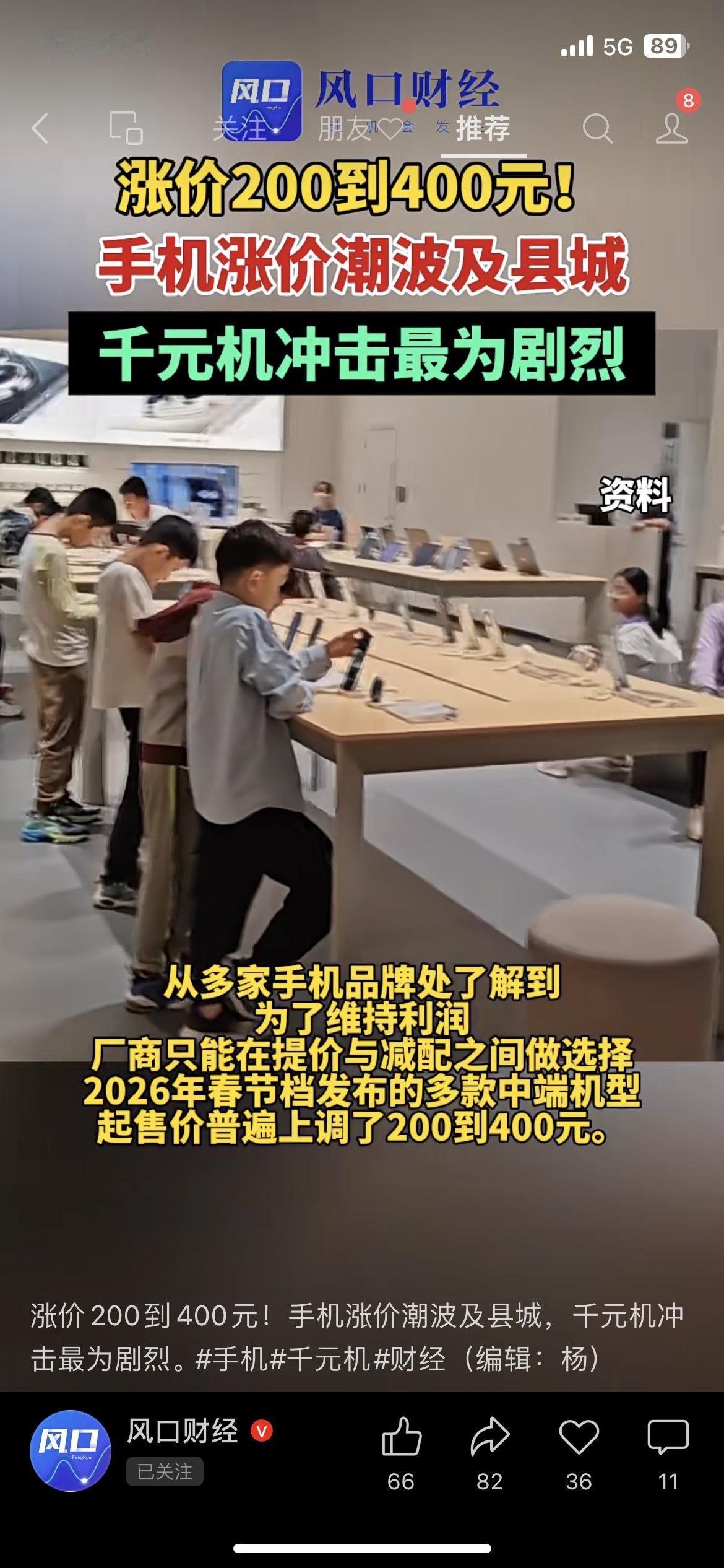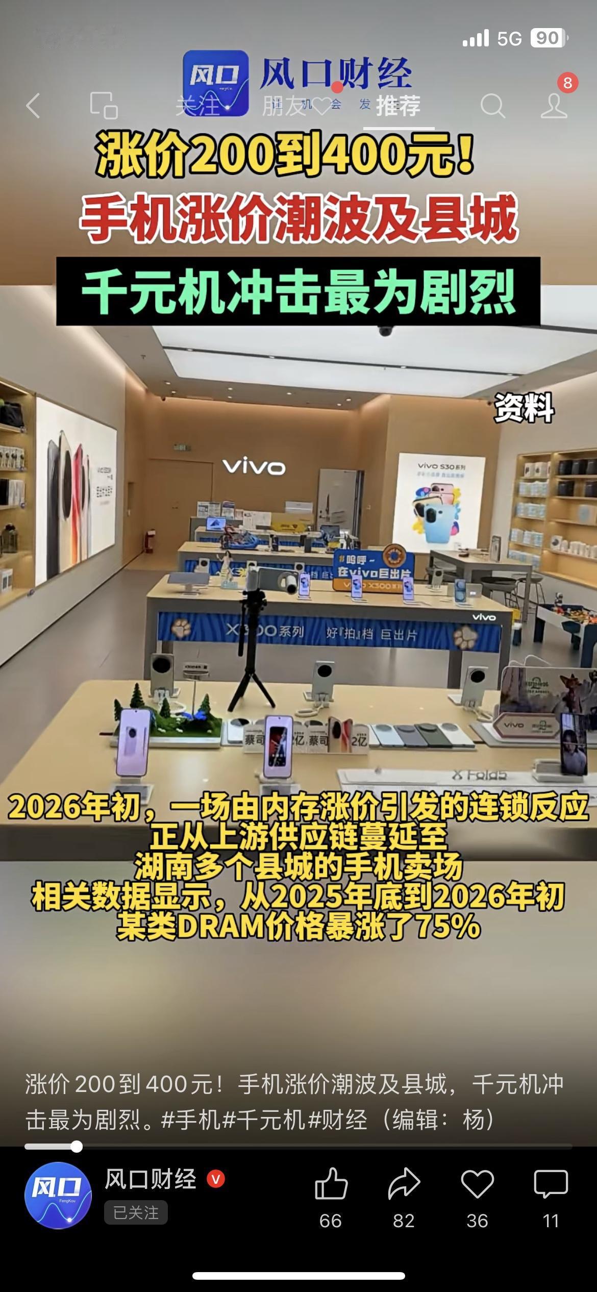 今天刷到个扎心的新闻:手机涨价潮已经从一二线城市,悄悄蔓延到县城了。 在湖南某县城的手机店里,一个年轻人盯着新款手机的标价皱起了眉头:“去年看的时候还是1999起,现在怎么2199了?” 店员说,这轮涨价普遍在200-400元,千元机受到的冲击最剧烈。 原因也很直接:从2025年底到2026年初,某类DRAM内存价格暴涨了75%,而存储芯片在千元机的物料成本里占比,远高于高端机,所以千元机最先扛不住。 我妈昨天还打电话问我:“家里的旧手机卡得不行,想换个千元机,现在涨价了,要不要再等等?” 说白了,这就是上游供应链涨价,最后由咱们普通人买单。 对预算有限的县城年轻人、给爸妈换手机的打工人来说,这几百块的涨幅,真的挺肉疼的。 你们那边的手机涨价了吗?是打算等等,还是直接下手了? 手机涨价 千元机 县城消费 供应链 消费提醒手机销量下降