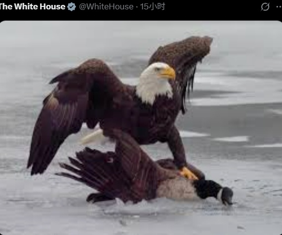 冬奥会22日男子冰球决赛美国队以2:1险胜加拿大队,然后白宫X平台官方账号发了一张白头鹰攻击加拿大雁的图片,哈哈,这就是特朗普团队的风格。明白了吧,与美国打交道根本不用讲什么礼数,他们的集体认知和价值观基本是森林野人的那一套。对他们只需亮拳头,还有弓箭。