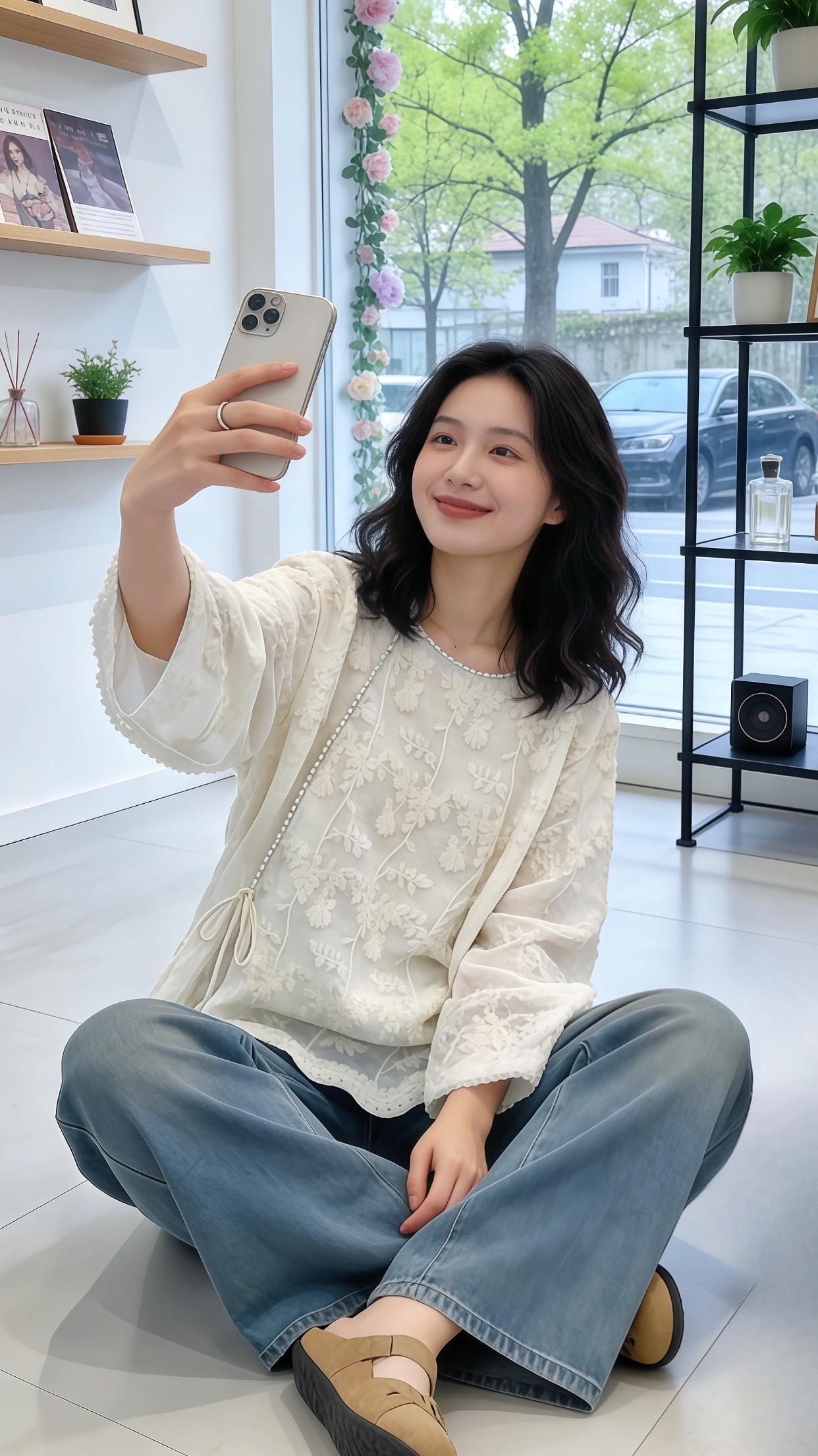 风拂柳,粉樱绽放,我身着浅粉蕾丝旗袍,立于古栏之下。长袖轻笼,盘髻缀珠,耳坠摇曳