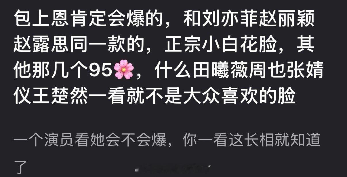 有网友说包上恩肯定会爆的,她和刘亦菲赵丽颖赵露思同一款的,正宗小白花脸,大家看好