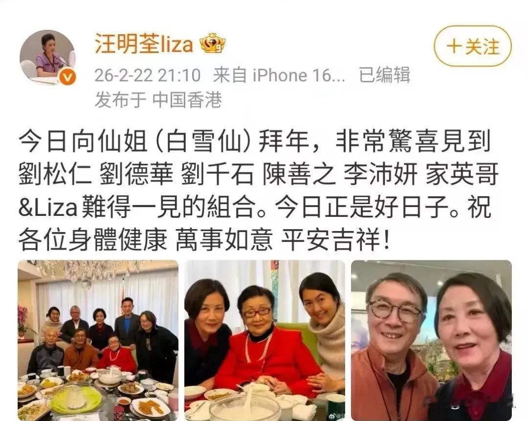 汪明荃夫妇,难得一见的聚会! 2月22日可是个好日子,阿姐汪明荃和罗家英夫妇,按照老传统去给97岁的粤剧泰斗白雪仙拜年。本来以为是场普通的聚会,结果您猜怎么着?在仙姐的半山豪宅里,竟然"活捉"到了一只野生华仔! 说真的,看到合照的那一刻,我真心想问一句:华仔,你是吃了防腐剂吗?今年都64岁了,穿着简单的黑外套配蓝内搭,往那一站,身形挺拔,脸上没有一点赘肉,这状态说是四十多岁也有人信啊 。 但这张照片最戳我的,还不是华仔的帅。在娱乐圈这个名利场,为了一个C位争得头破血流的事儿咱见多了。可到了大合照环节,作为巨星的刘德华,没有往中间站,而是默默退到了最后排的最边上,把中间的位置让给了阿姐,让刘松仁和罗家英两位前辈稳稳地坐在前排 。 这种刻在骨子里的谦卑和尊重,真的装不出来。难怪阿姐都忍不住发文说这是"难得一见的组合" 。说白了,大家之所以这么喜欢华仔,不光是因为他帅,更因为他有一颗金子般的心。看着97岁的仙姐精神头这么足,老友们又能聚在一起,这才是过年该有的温情画面啊!祝各位前辈身体健康,咱们明年接着聚!