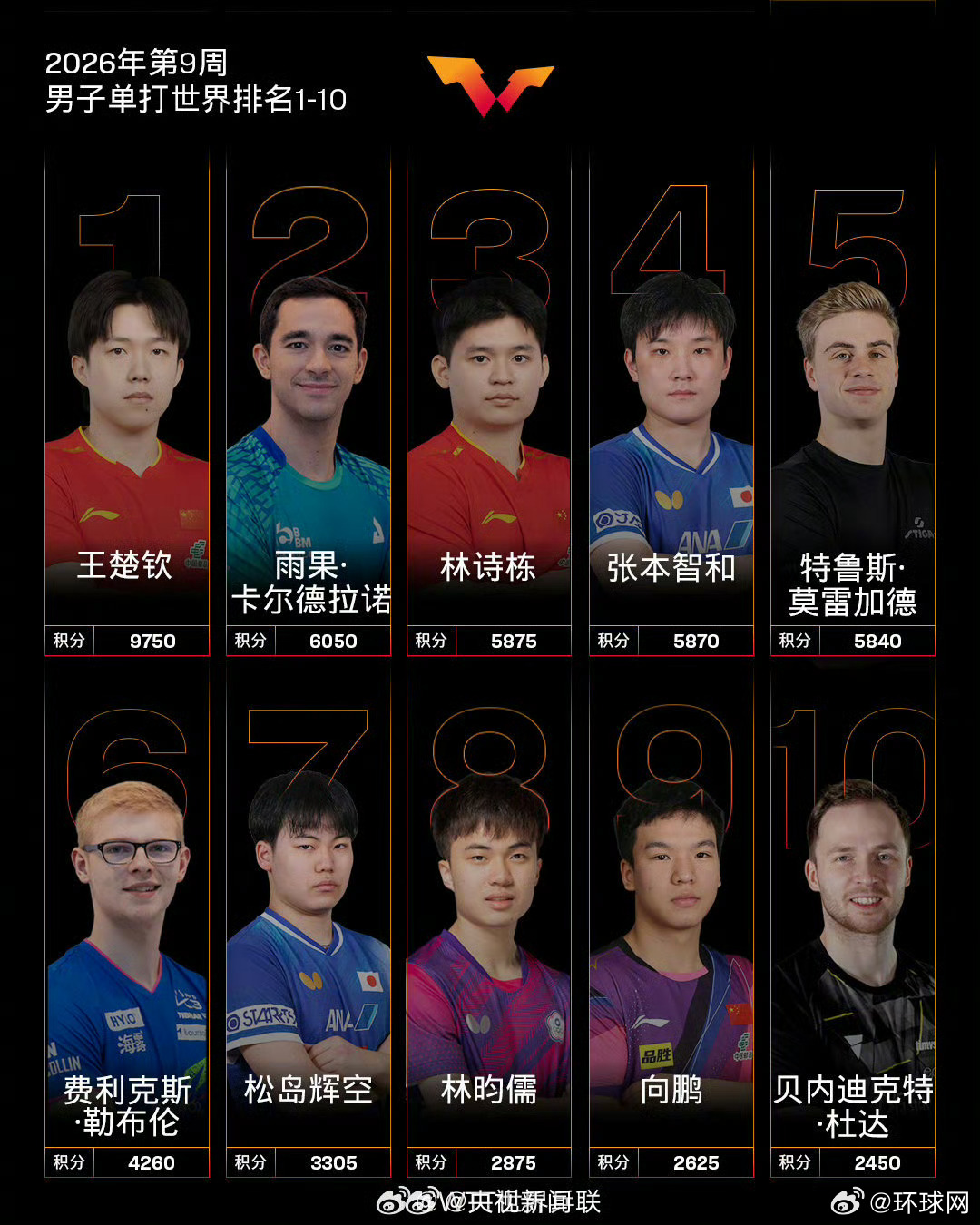 【#孙颖莎王楚钦继续霸榜世界排名#】#孙颖莎王曼昱陈幸同包揽世排前三# 今天,国际乒联公布2026年第9周世界排名↓↓