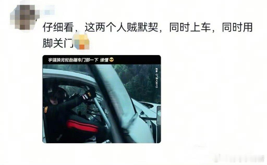 沈腾尹正踹车关门关我心巴上了 雨中换胎累到不想说话,上车那一下踹门,是发泄也是习惯。沈腾尹正这一下,把赛车里手的糙和帅全演出来了。