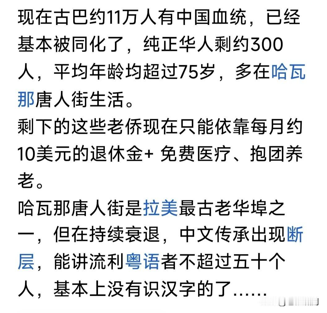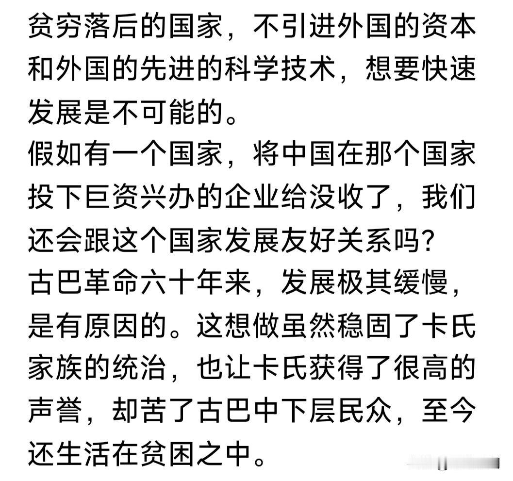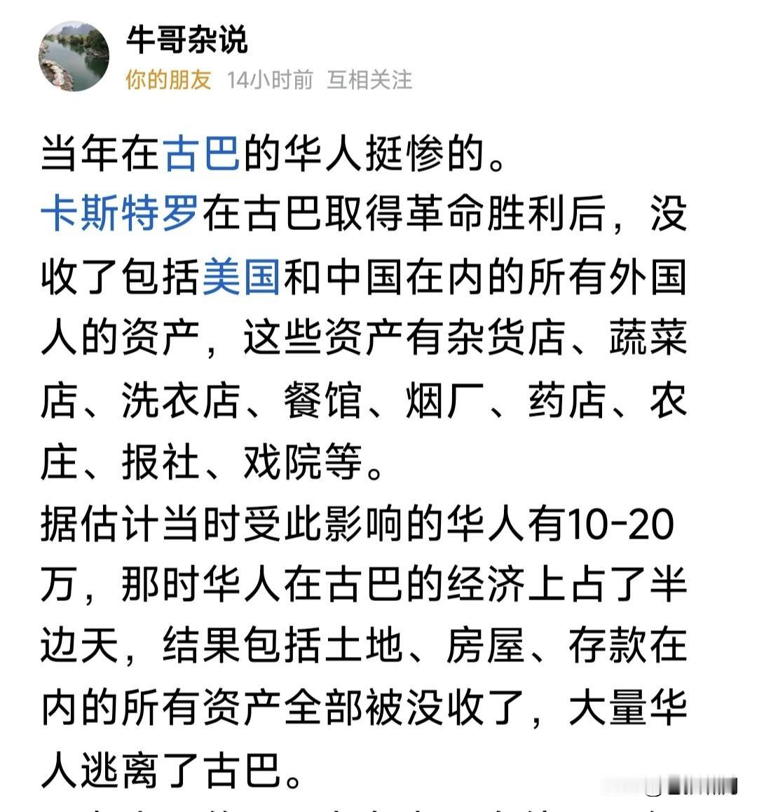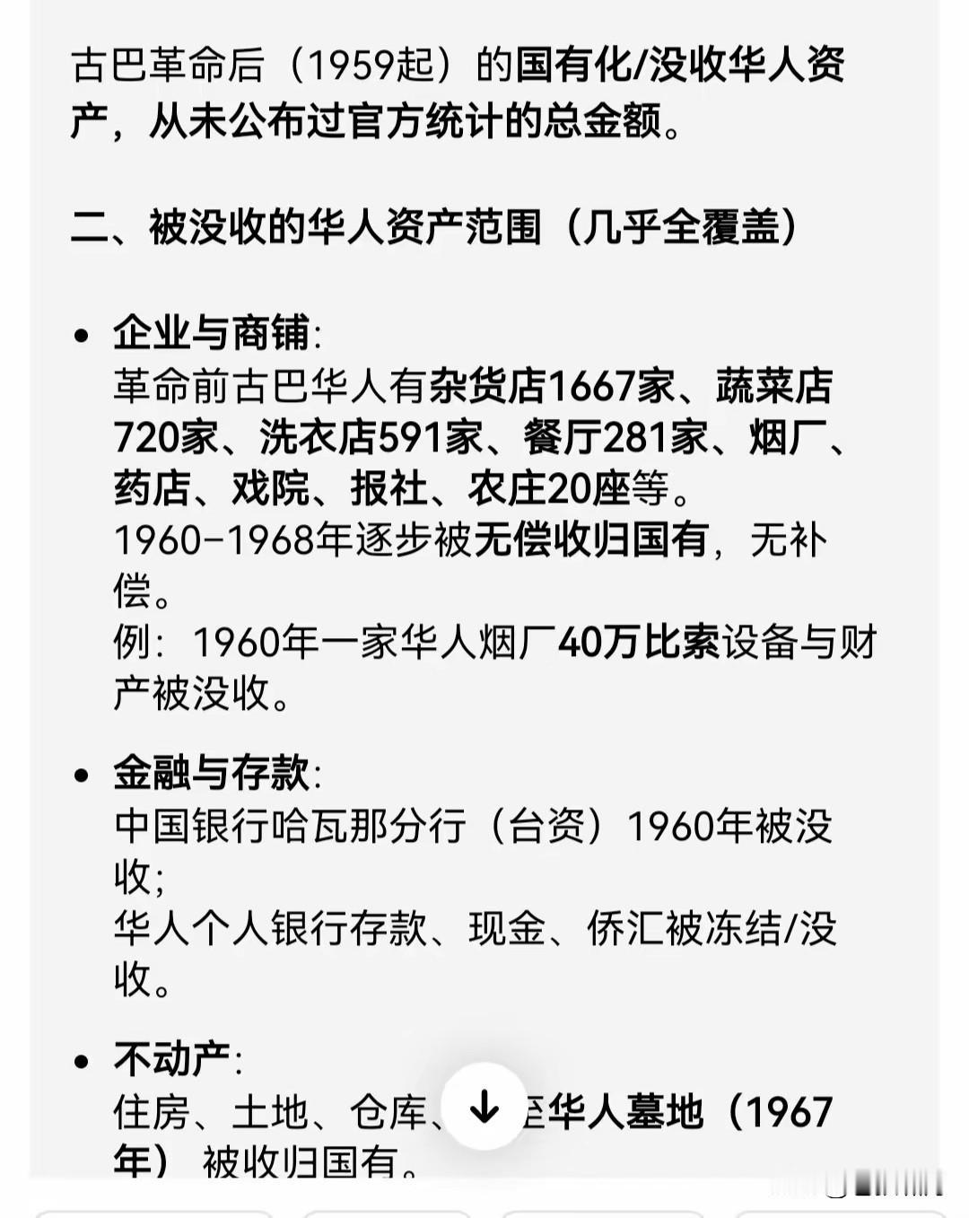 不敢相信!古巴当年没收美帝6000多家企业,还没收华人企业3279家。 古巴没收的华人企业,包括杂货店1667家,洗衣店591家,餐厅281家,烟厂药店戏院报社农庄20个,还有银行与土地住房仓库墓地等固定不动产。 以上华人财产,均于1960~1968被古巴没收充公,无任何赔偿。使10~12万华人受影响,大部分逃离。现仅存纯正华籍老人数百,靠微薄养老金度日。 美国为何长期封锁古巴?就因古巴没收其6000多家企业,并一直秉持反美立场结下的仇怨!这件事放在谁的身上,能咽下这口气吗?估计应该不会。 资料显示老卡革命前,古巴是比较富裕的。但老卡革命后,没收外企私企资产归公,古巴经济失去活力,数十年发展不起来。至今仍然处于贫困状态。 有人把古巴目前贫困落后,归咎于美帝长达80多年封锁!请问美帝为何要封锁他?他不没收6000家美企,致其数百亿美元损失,美帝会封锁他吗? 天底下哪有这种怪事?没收老美6000家企业,给人家造成数百亿美元损失,还要坚持反美?本质上讲是走“苏联模式”惹的祸,但古巴自身有无问题? 几十年过去,美古争斗不休。上世纪古巴导弹危机,美帝差点对古巴动手!最后时刻苏古软了,古巴逃过了一劫。 这次由俄乌战争,川普“二进白宫”促俄乌停战,进展不顺欲罢不能。于是先对鹅“小弟伊叙”,及其扶持的“哈真胡”下手,已初见成效。又对“委哥古伊”动手了!委认栽,哥屈服,伊也服软了。就看古巴还能坚持多久?据悉正谈判? 回望世界80多年历史,二战“正义联盟”胜利,给全球带来秩序和希望!谁想刮起一股逆流,殃及不少国家。但文明定会战胜野蛮,正义定会战胜邪恶!世界走向文明法治,人类定会更加美好! …………