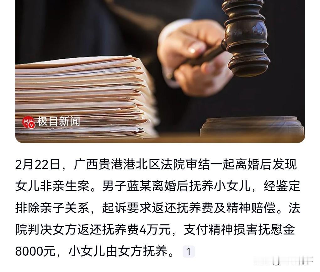 有些两性关系真够乱的。 2月23日热搜,离婚发现女儿非亲生男子获赔偿。 这男子太惨了,离婚后发现小女儿不是自己亲生的。 于是起诉女方要赔偿。 女方总共赔了48000块钱,这赔的也不多啊。 小女儿由女方抚养。 这种被戴绿帽子,或者生的孩子不是自己的,也报道过不少。