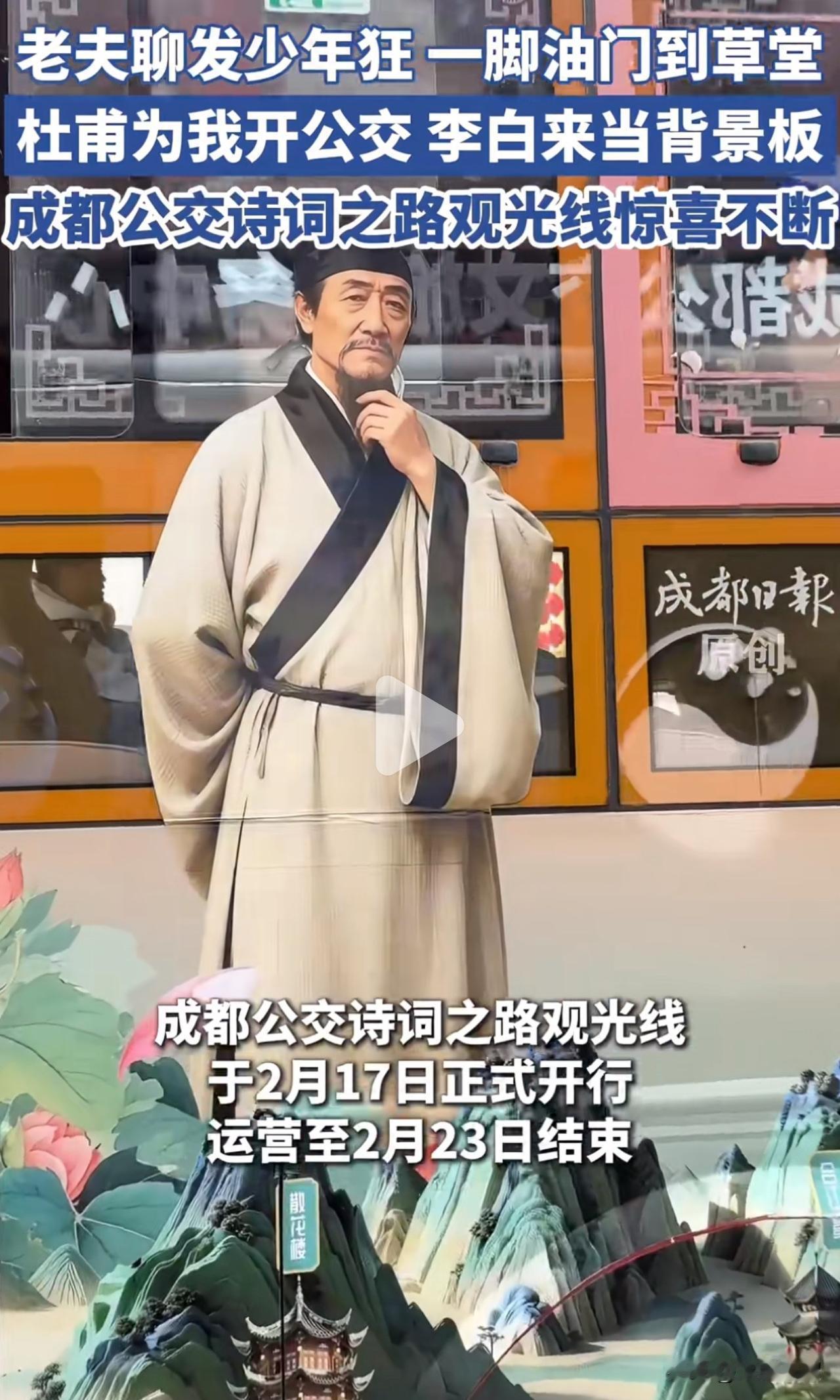 成都这公交诗词之路观光线太会玩了!司机扮成李白、杜甫,车厢背景板也是他们,反差感直接拉满。网友那句“老夫聊发少年狂,一脚油门到草堂”太妙。 这条线起点杜甫草堂北门,终点春熙路,串联多个景点。试运营期间往返票价 20 元,单程 10 元。每天 10:00、16:00 发车,到 2 月 23 日结束。经过浣花溪等点位还会播放诗词吟诵,车上还能打卡盖章,设“诗酒官”带玩飞花令。 怪不得人气这么高,22 号下午还加开了一班。不得不说,成都在文旅创意这方面狠狠拿捏了!