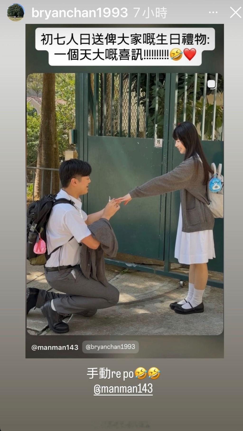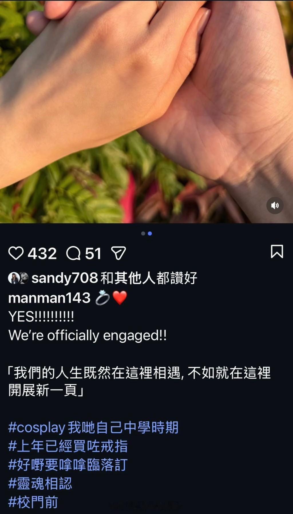 陈耀淙在限时动态兴奋写道:“初七人日送给大家的生日礼物:一个天大的喜讯!”还标记了未婚妻。而陈耀淙女友Manman也在IG分享喜悦,上传一张戴上求婚钻戒、二人紧握双手的照片,甜蜜宣布:“YES!!!!!!!!!! We're officially engaged!!”