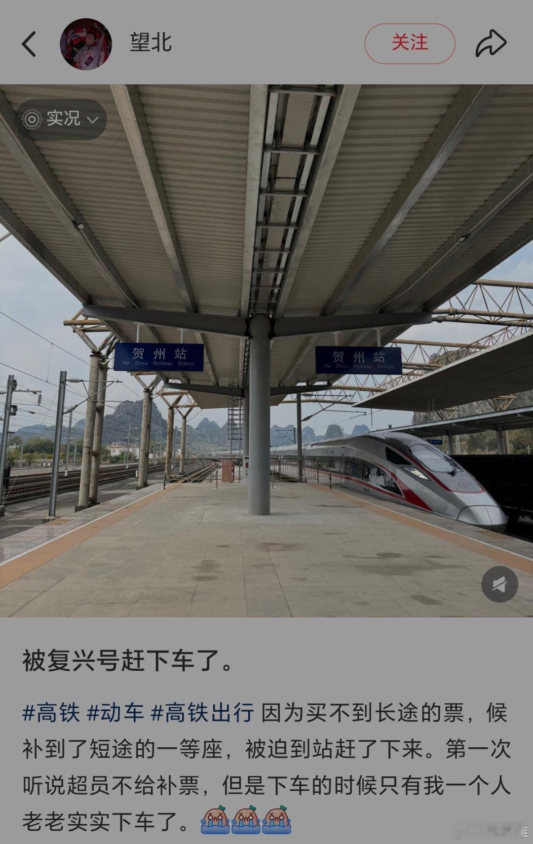 网友发文因买不到长途的票,就侯补到了复兴号短途一等座,结果刚一到站就被赶下了列车。