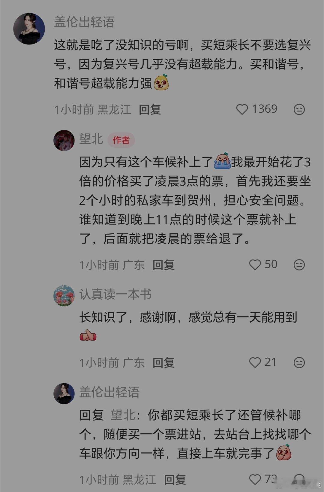 随后,评论区网友支招买短乘长选和谐号,并分享了区分复兴号与和谐号的技巧。