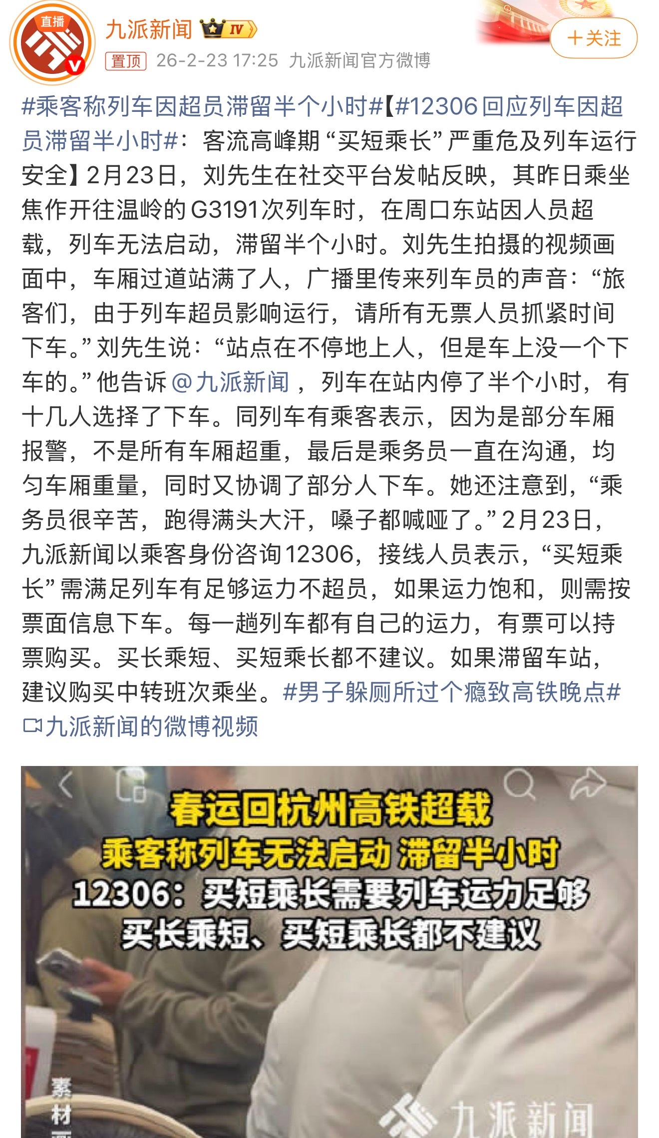 12306回应列车因超员滞留半小时没办法,始发站-终点站基本都有票的,而中间站-终点站全部售完,候补也没用。