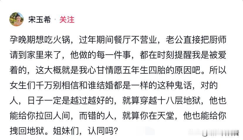 宋玉希过年期间非常想要吃火锅,可惜火锅店都没有开门,宋玉希馋的不行了,让老公想办法,老公果然不负所望,把厨师请到家里,现切梅花肉,冰镇大虾,刺参,还有宋玉希最爱吃的大油条,全部安排到位,这跟去火锅店里吃没啥区别。 宋玉希在看到老公的用心后不禁发文说,他做的每一件事情,都在时刻提醒我是被爱着的,这大概就是我心甘情愿五年生四胎的原因吧。她还特意提醒姐妹们,不要相信跟谁结婚都一样这样的话,找对人,日子越过越好,找错人就会很糟糕。