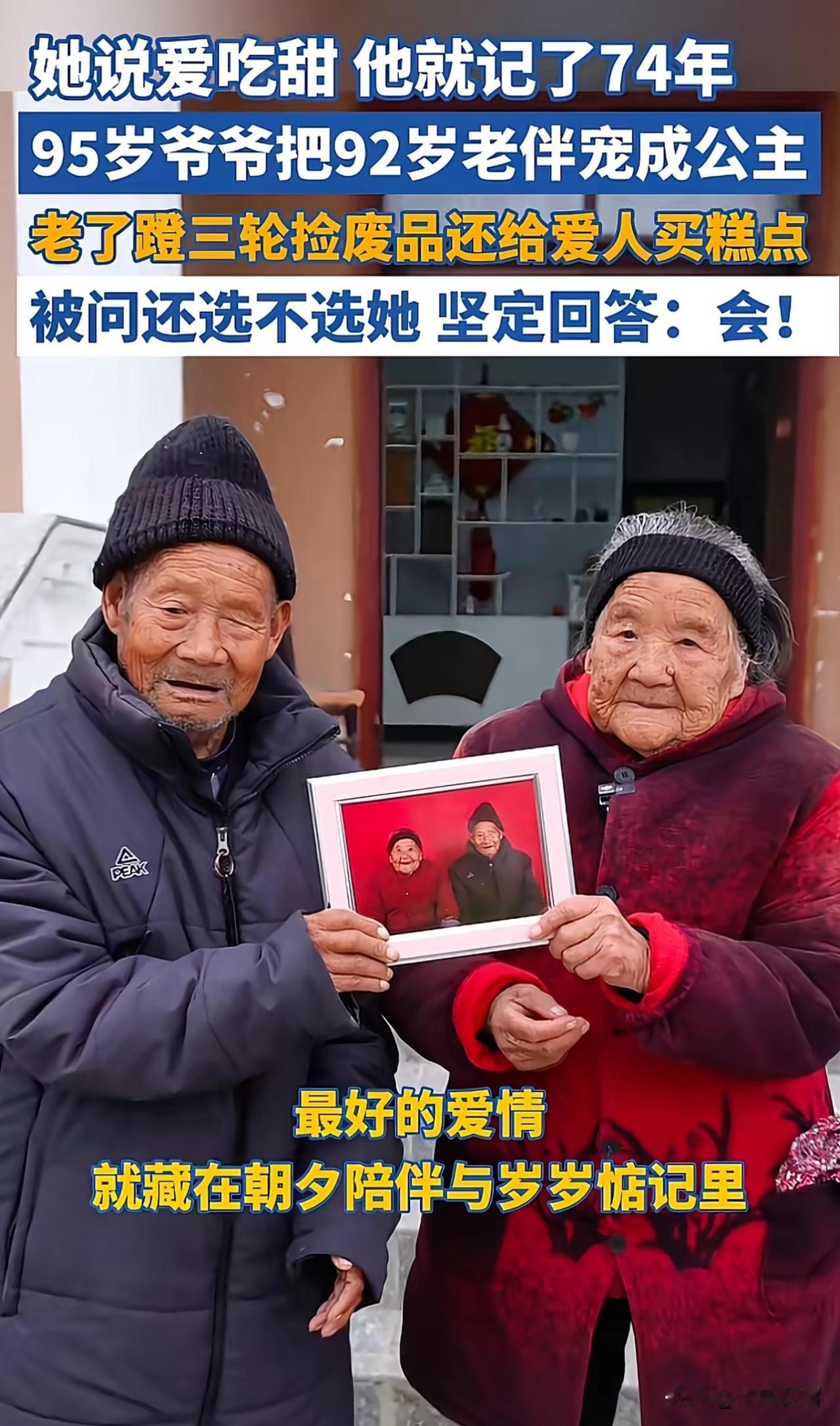 这对传奇老夫妻的爱情故事把人看哭了! 老爷爷叫李传忠,今年95岁。老奶奶叫李正英,今年92岁。两人青梅竹马,1952年结婚,结婚74年,爷爷就呵护了奶奶74年。 奶奶喜欢吃甜食,爷爷记住了她的喜好,年轻时每次收工回来都会给奶奶带小点心;年纪大了之后,爷爷就骑着三轮车捡废品,卖钱后都给奶奶买爱吃的甜食。 70多年来,爷爷简直把奶奶宠成了公主。有人问爷爷,如果有下辈子,你还会选择奶奶当老婆吗?爷爷坚定地回答:“会!” 两位老人结婚已经74年,而这74年里爷爷疼奶奶的方式就是“让她的嘴巴甜一点”。这段187岁的爱情已经整整跨越了一个世纪。 世界上最美好的爱情是什么?那就是一辈子牵一个人的手,一辈子宠着一个人,把对方的喜好藏在点点滴滴中,藏在柴米油盐中。