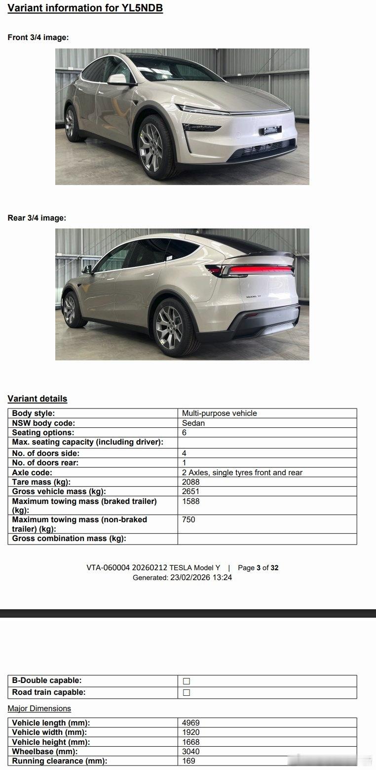 澳大利亚 ROVER 官网显示,特斯拉 Model Y L(六座版,代号 YL5NDB)已获批在当地市场销售,预计今年一季度上市!