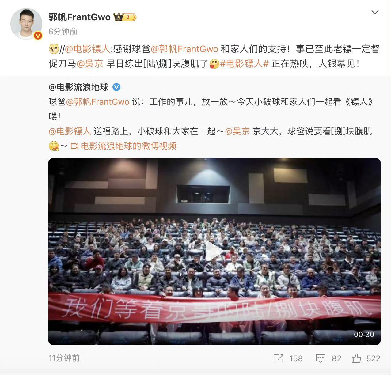 郭帆要看吴京八块腹肌 《流浪地球》官微发博支持吴京新电影《镖人》,配文“球爸要看捌块腹肌”,在线催。太有趣了!