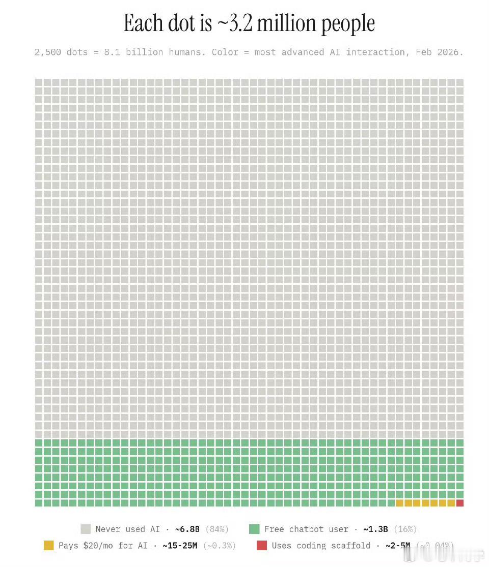 这图确实告诉我们一个有意思的事儿:我们以为的AI已经铺天盖地了,比如车里、手机里、甚至春晚里… 但放到全球范围,连门都还没摸到的人占绝大多数。