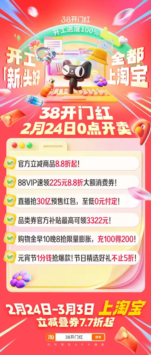 开工新头好全都上淘宝真心安利!开工第一天别瞎忙,速上🍑搜「38开门红」 !2.24-3.3官方立减叠券7.7折起,叠加88VIP大额消费券超划算 。美妆服饰家电全涵盖,我的购物车已加满,快冲不亏!天猫38迎新而上