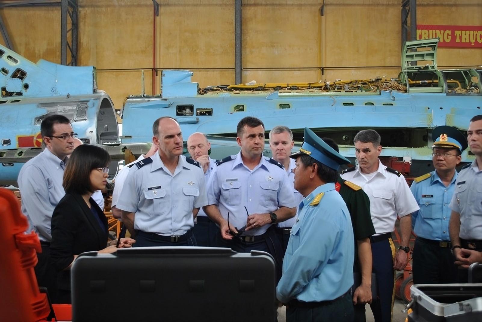 越南人民空军A32工厂的员工正在带领美国空军学院的代表团参观工厂。背景中是一架苏霍伊Su-22M4战斗轰炸机,这是A32工厂翻新的几种飞机之一。烽火问鼎计划越南