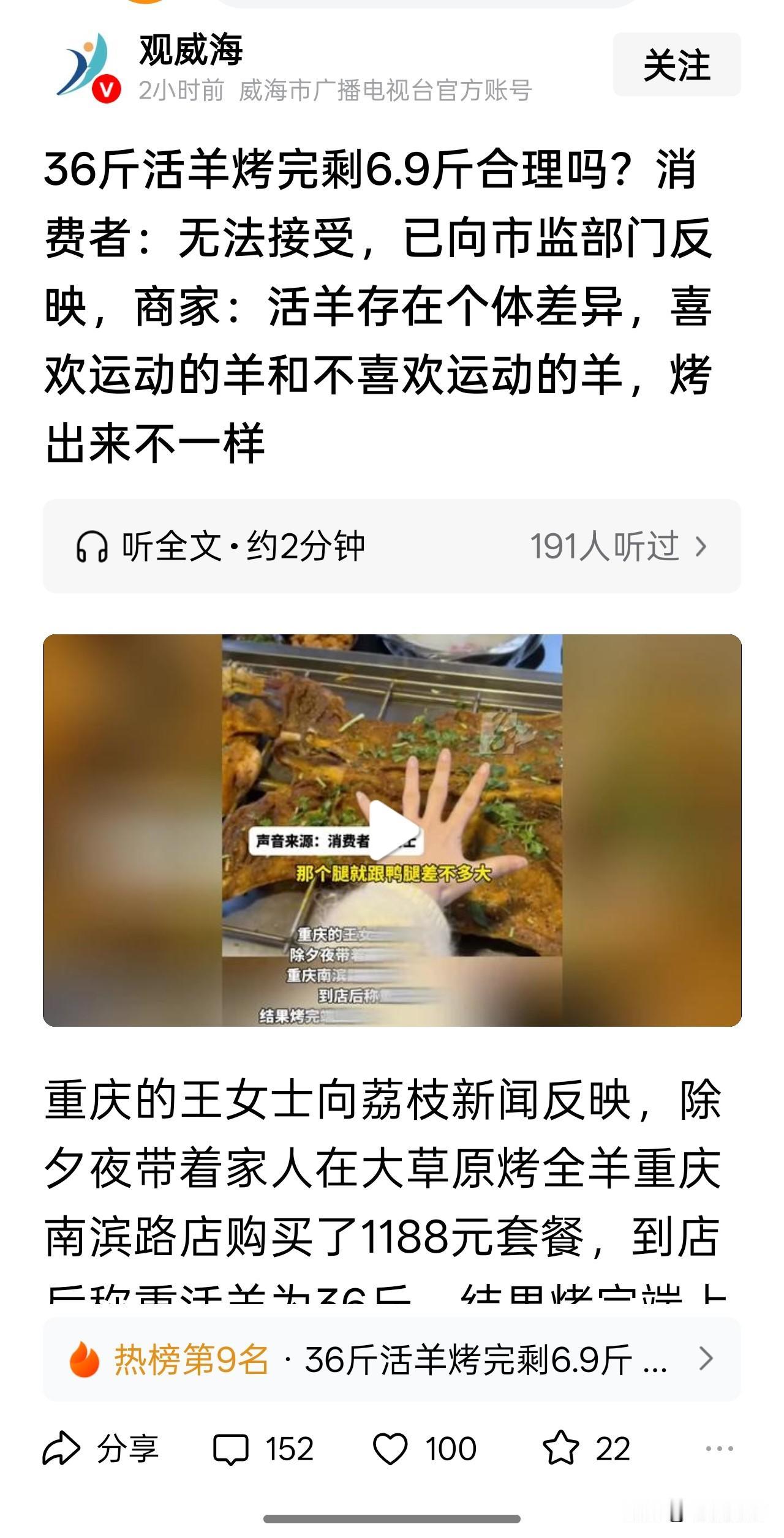 吃烤全羊时36斤活羊烤好后只剩下 6.9 斤,顾客表示无法接受,商家则称是个体差异,运动和不运动的羊烤出来完全不一样。[笑哭] 不管你信不信,解释还是要有,不过好在事情不是由他们单方面说了算。看了一下评论,大致认可活羊能烤出3-4成的烤肉,也就是说“个体差异”不过是一成的量,少的那部分需要有合理的说法。 羊和羊的个体差别并没那么大,但人与人的差别可能是天差地远。[笑哭]