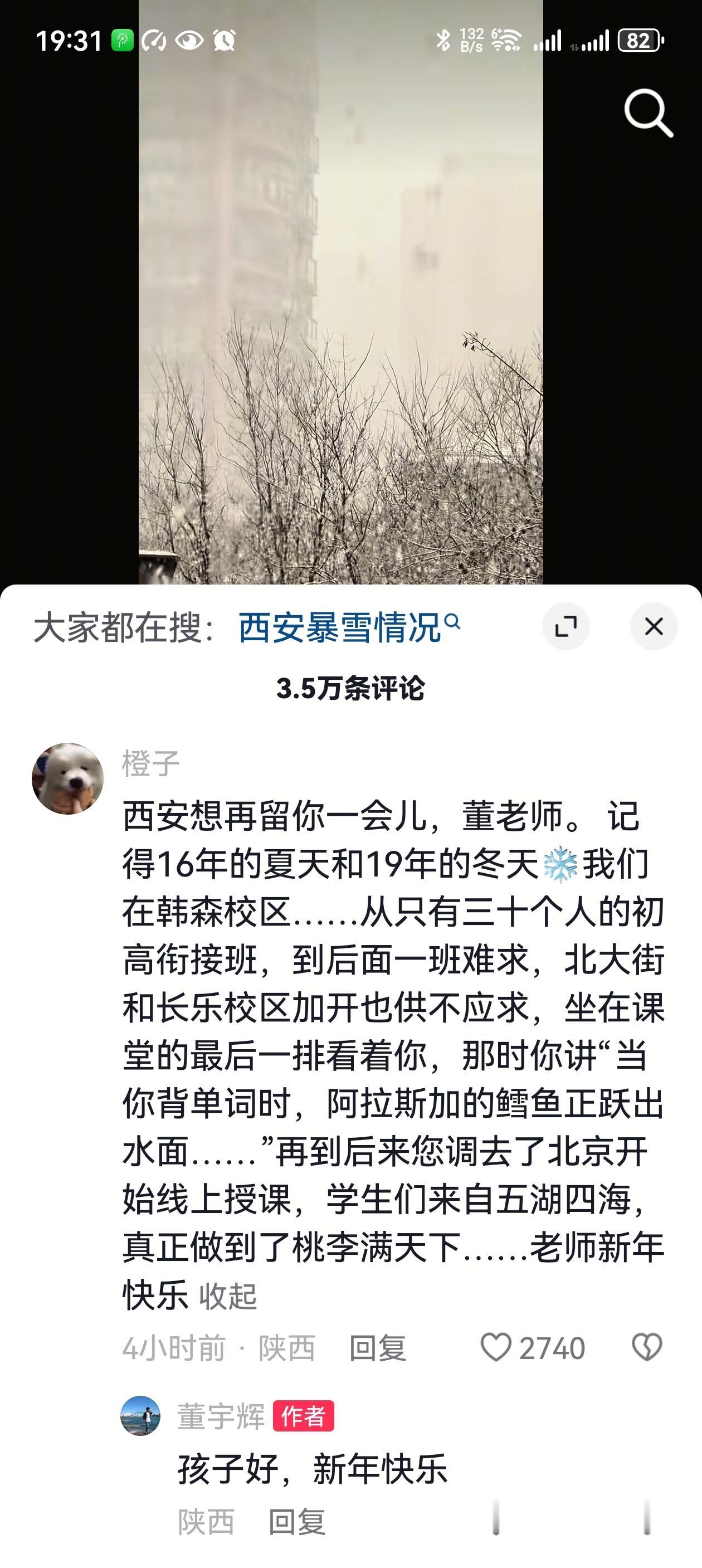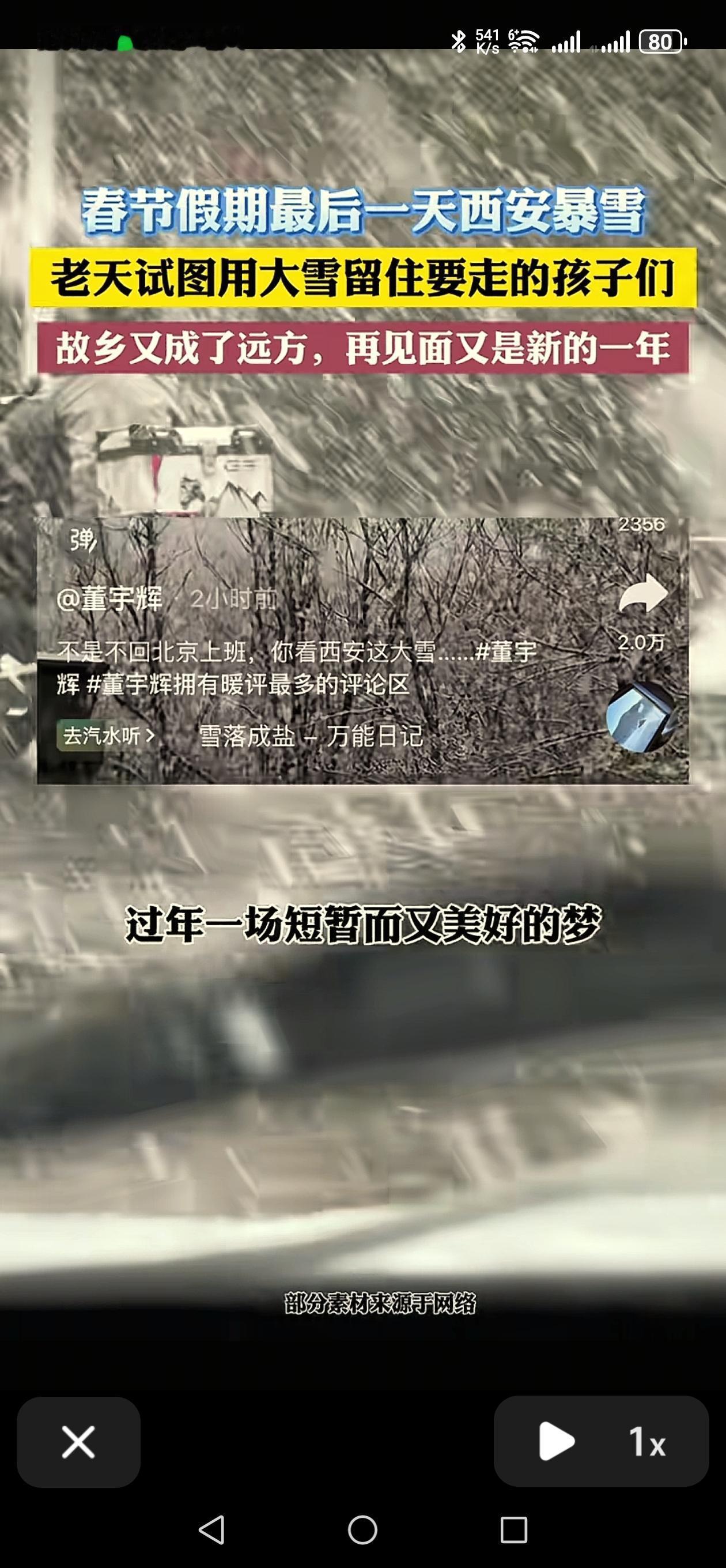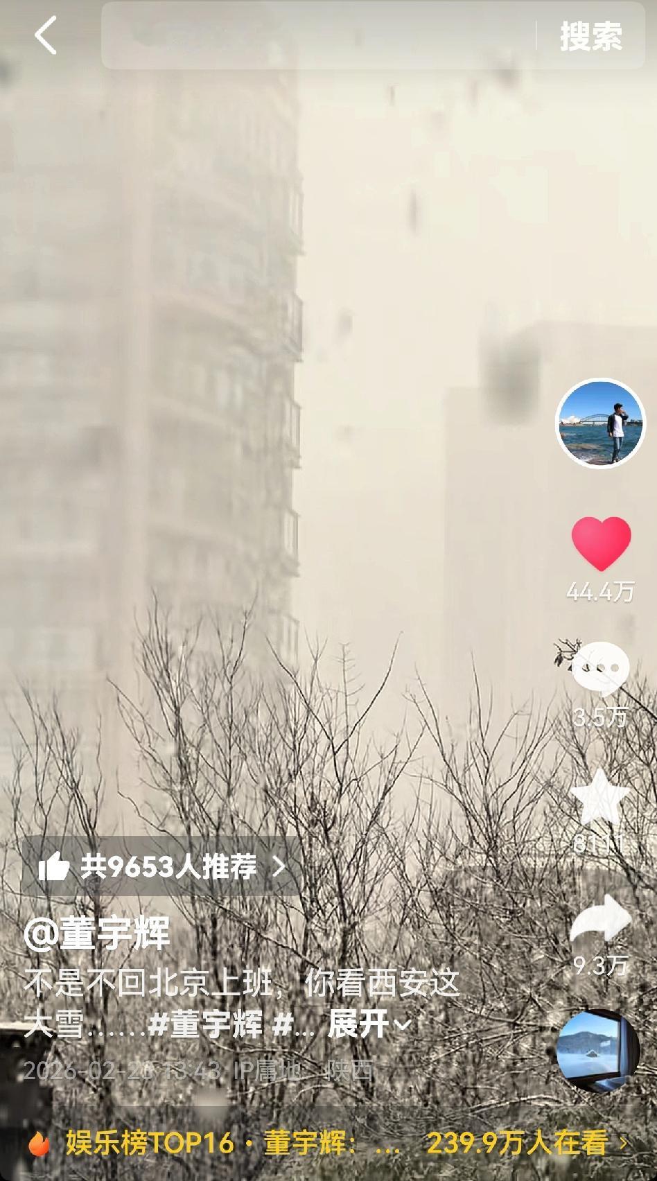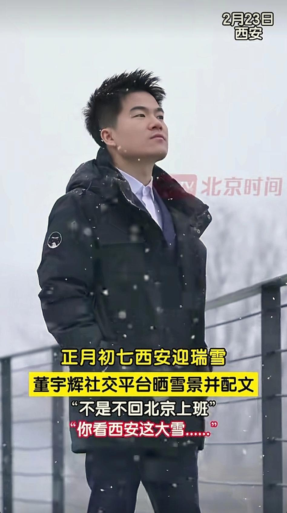 春节悠长假期最后一天,西安暴雪留下了董宇辉,不想上班的老板,道出了异乡打工人的心声。董宇辉的抖音视频,“不是不回北京上班,你看西安这大雪…”登上了娱乐版的热榜。 董宇辉曾说,过年是一场短暂而美好的梦,梦醒了,人们又要去很多城市忙工作,只有离开故乡的时候,才会念叨故乡。在异乡打拼的职场人,只有过年才能和家人温馨共处,这段时光,也不过是从年三十到大年初七,短短8天。董宇辉一直是个恋家的孩子,很少见到一个事业有成,扬名立万的人,如此眷恋故乡的生活,名利场中的荣耀,不是他的最爱。 想念他的粉丝们已经半个月没有在直播间见到他,甚是想念。有人调侃说下雪高铁没有停运,也有人说大雪留人,好好休息,元宵节再回来。还有人建议他在西安的分公司直播间直播,最懂他的是曾经的学生,当年的一场大雪,他和学生们在一起过年。他回复,依然称他的学生为孩子。 对于深陷网暴数月,春节难得清静几日的宇辉来说,这白茫茫大雪一片真干净。君子高洁,以雪明志,董宇辉喜欢雪天,漫天风雪留一人,妙。