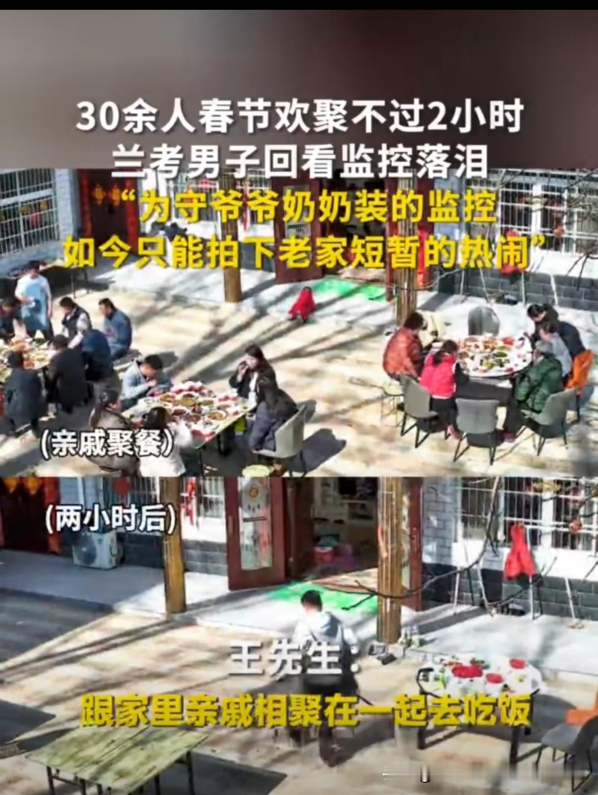 看到河南一位哥们儿老家监控拍下的画面,鼻子一酸。院子里30多个亲戚热热闹闹吃饭,不到俩小时,人走光了,只剩空荡荡的院子。他说,看完监控心里空落落的。 这监控本来是为爷爷奶奶装的,如今老人不在了,倒成了记录“年味”最短的见证者。 我们在外打工的,谁不是这样?一年被工作卡得死死的,中秋国庆赶一趟,春节赶一趟,回趟家像打仗。抢票、加班调休、路上折腾十几个小时,就为了回家吃顿团圆饭,见见想见的人。可刚坐下没聊几句,看看手机里的工作群,又得算着返程时间。 老板不会问你“老家热闹吗”,领导只关心你几号到岗。我们拼命协调出来的假期,压缩了所有想念,变成一场短暂的奔赴。 不是不想多待,是时间真的不由人。那些匆匆离开的背影里,有明天要赶火车的表姐,有晚上要值班的堂哥,还有像我这样,第二天就得回城市上班的人。 有时候觉得,我们这代打工人的春节,就是一次次高效的“情感压缩包”——把一年的牵挂,挤进几个小时里说完、吃完、看完。 可就算这样,还是想回。哪怕只是陪爸妈吃顿饭,看看老屋的监控,知道那里曾经装满过笑声。 也许,这就是过年最真实的样子吧:用短暂的拥挤热闹,去对抗一整年的漫长冷清。 扛着行李奔波的意义,大概就是为这两小时! 你们呢?今年在家待了多久?