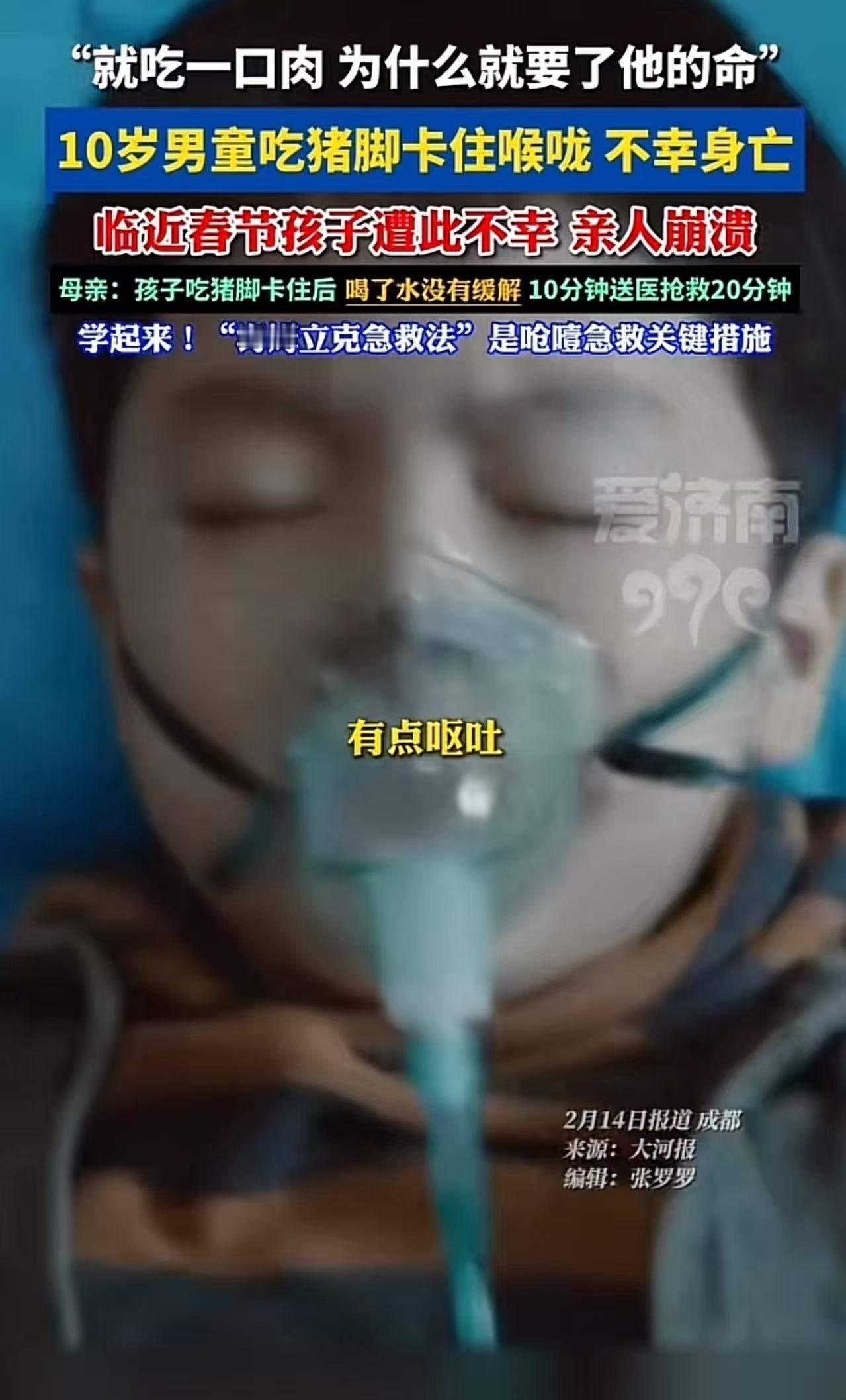 这条新闻让无数人心头一紧,仿佛一块巨石压在胸口。一个原本欢快的家庭,因为一场意外,瞬间陷入无尽的悲痛。10岁的男孩,正是最天真烂漫的年纪,只因吃了一口猪脚,便永远离开了父母的怀抱。母亲哀伤地说:“至今想不明白,吃一口肉为什么就要了他的命!”这一句,听得人心碎。 养育一个孩子有多难?每个父母都懂。孩子的每一次成长、每一次笑容,都是父母用心血和汗水换来的。可意外,总是猝不及防。网友纷纷留言:“家里有小孩的看到这种新闻心里堵得慌!”“养大一个孩子真的好不容易,母亲一辈子要活在自责当中了!”这些评论,不只是同情,更是每一个家庭的切身感受。 其实,这场悲剧背后,藏着我们每个人都可能忽视的风险。生活中,孩子们总是好奇、贪吃,但他们的咽喉、气管还未发育成熟,稍有不慎就可能酿成大祸。我们常常以为,危险离自己很远,却不知它就在身边。很多父母都在忙碌中疏忽了对孩子的细节关照,而一旦发生意外,后悔和自责会伴随一生。 这起事件,不只是一个家庭的悲痛,更是对所有父母的警示:守护孩子,真的不能掉以轻心。我们要做的不仅仅是爱他们,更要用科学和细心去保护他们。比如,吃饭时要提醒孩子细嚼慢咽,不要边玩边吃;遇到卡喉,第一时间要掌握急救方法。每一份警惕,都是对生命的尊重。 或许,悲剧无法逆转,但我们可以用它唤醒更多人的安全意识。让每一个家庭都多一份防范,让每一个孩子都能平安长大。人生无常,唯有珍惜当下,才能不让遗憾成为永远的痛。 你怎么看?你有没有类似的担忧和经历?欢迎留言,说出你的心声,让更多人看到、重视、行动起来。孩子的安全,需要我们每个人共同守护。救人男孩遇难 男童意外身亡