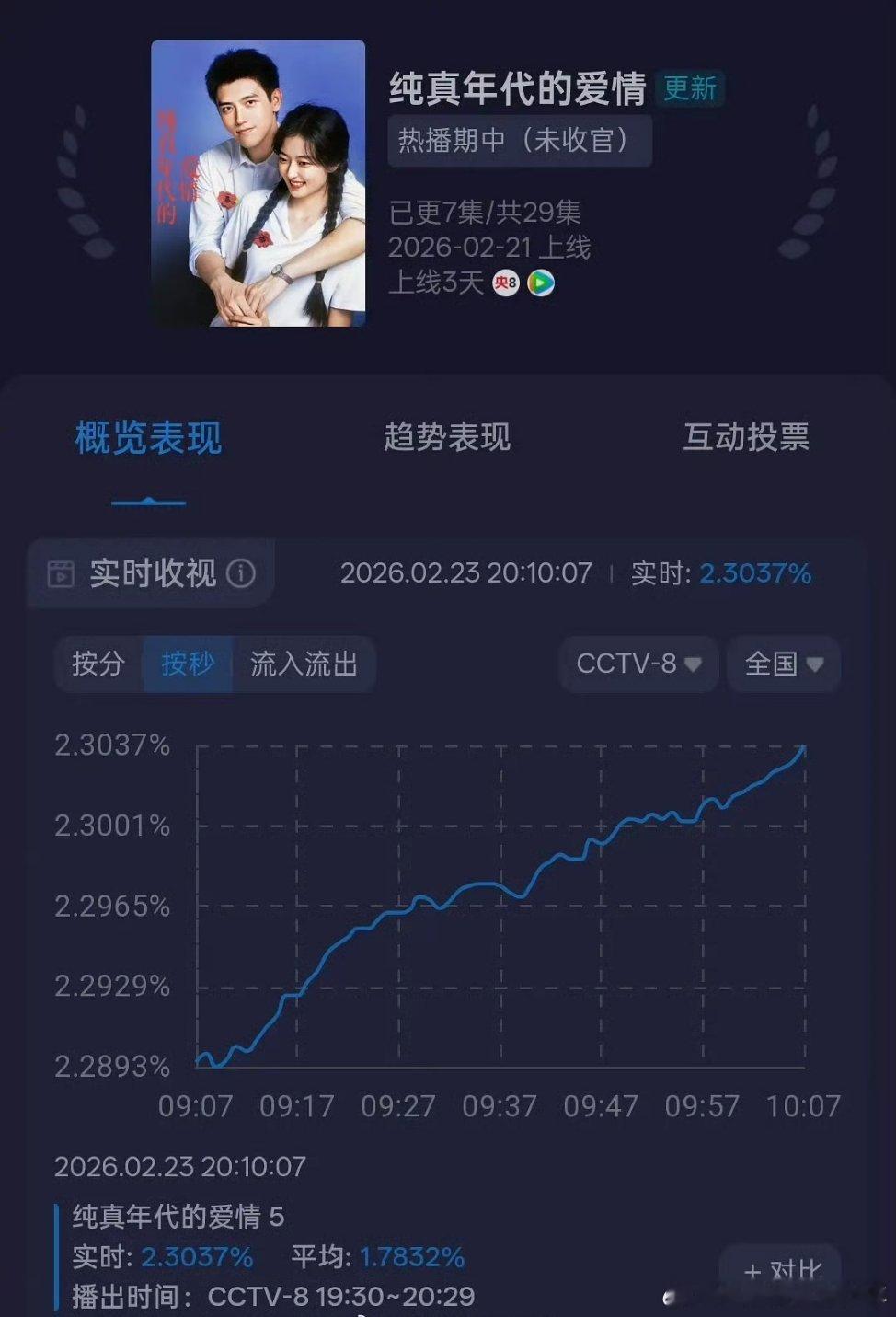 📣📣📣陈飞宇《纯真年代的爱情》实时收视2.3了,创新高还在上涨中纯真年