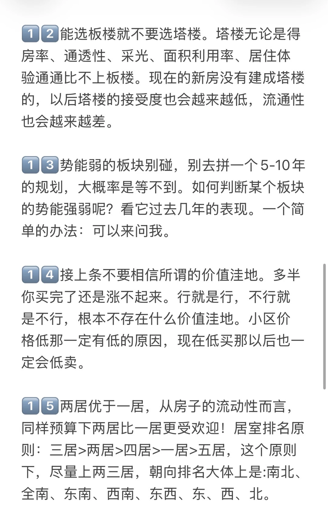4️⃣月供决定持有时间,建议留够至少两年的月供作为储备。另外不建议买一居室,总价低、单价高、不划算,且是置换底端。房子的地段也是最重要的,90%以上看地段,其次是房子本身的品质。