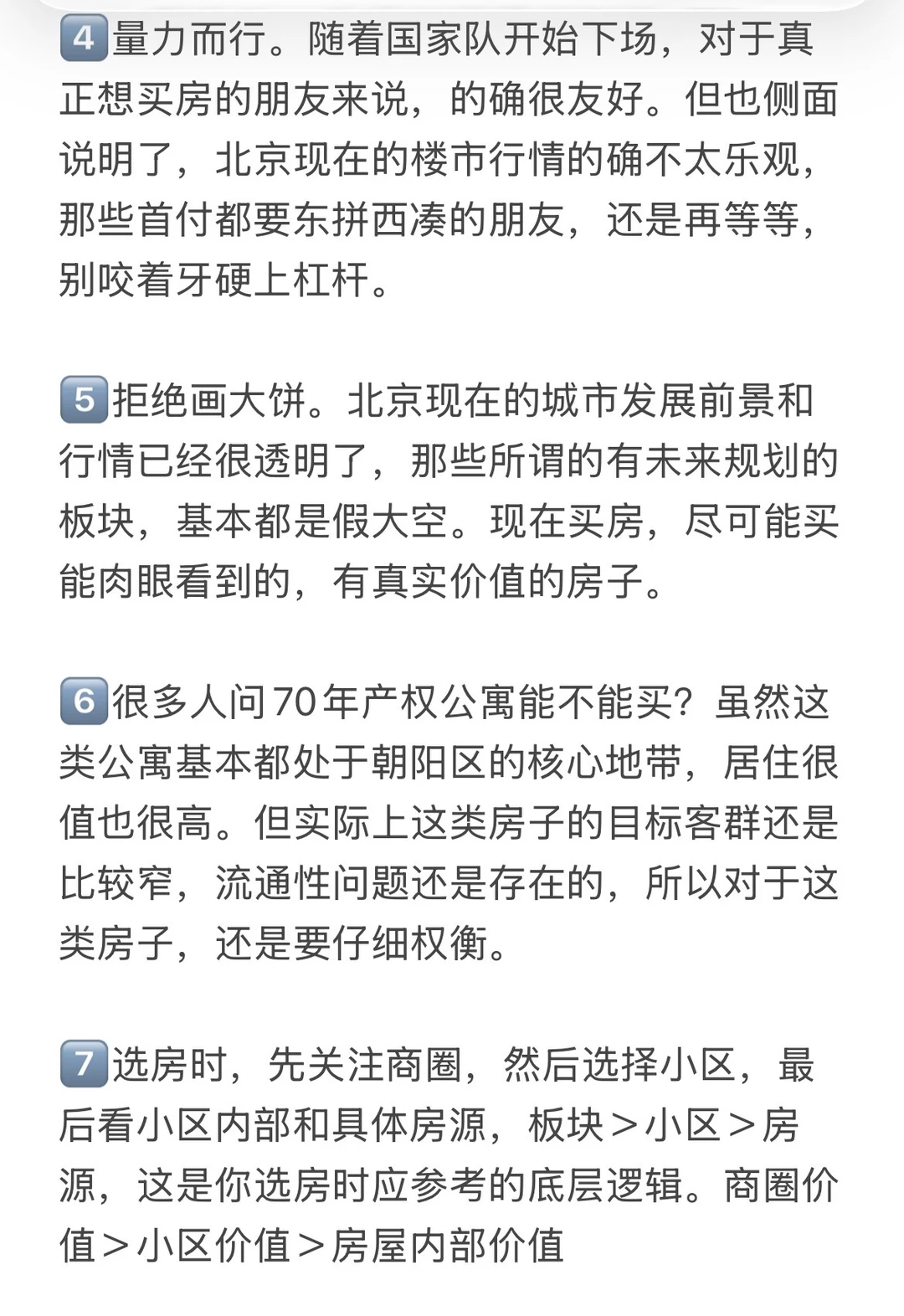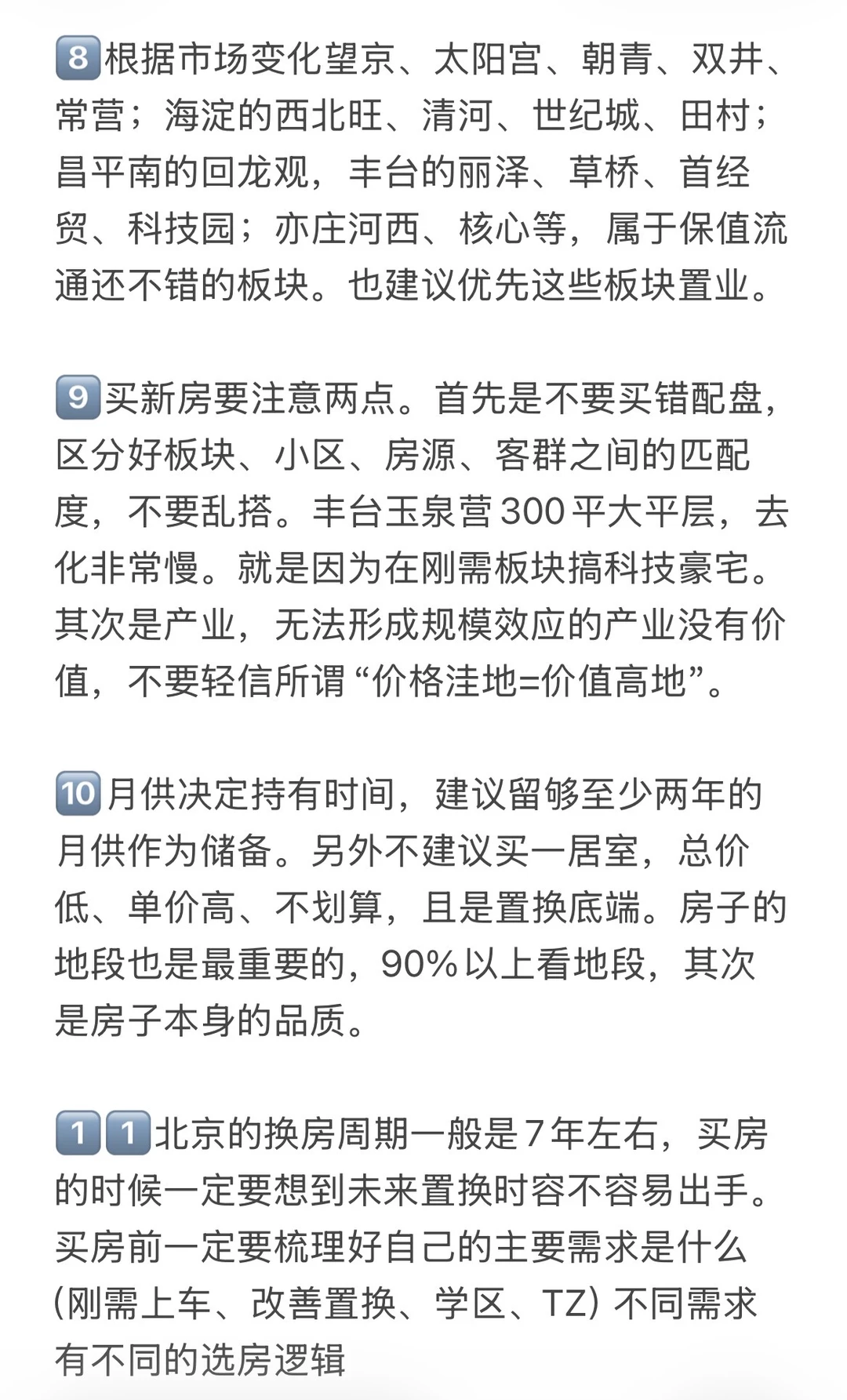 5️⃣北京的换房周期一般是7年左右,买房的时候一定要想到未来置换时容不容易出手。买房前一定要梳理好自己的主要需求是什么(刚需上车、改善置换、学区、TZ)不同需求有不同的选房逻辑